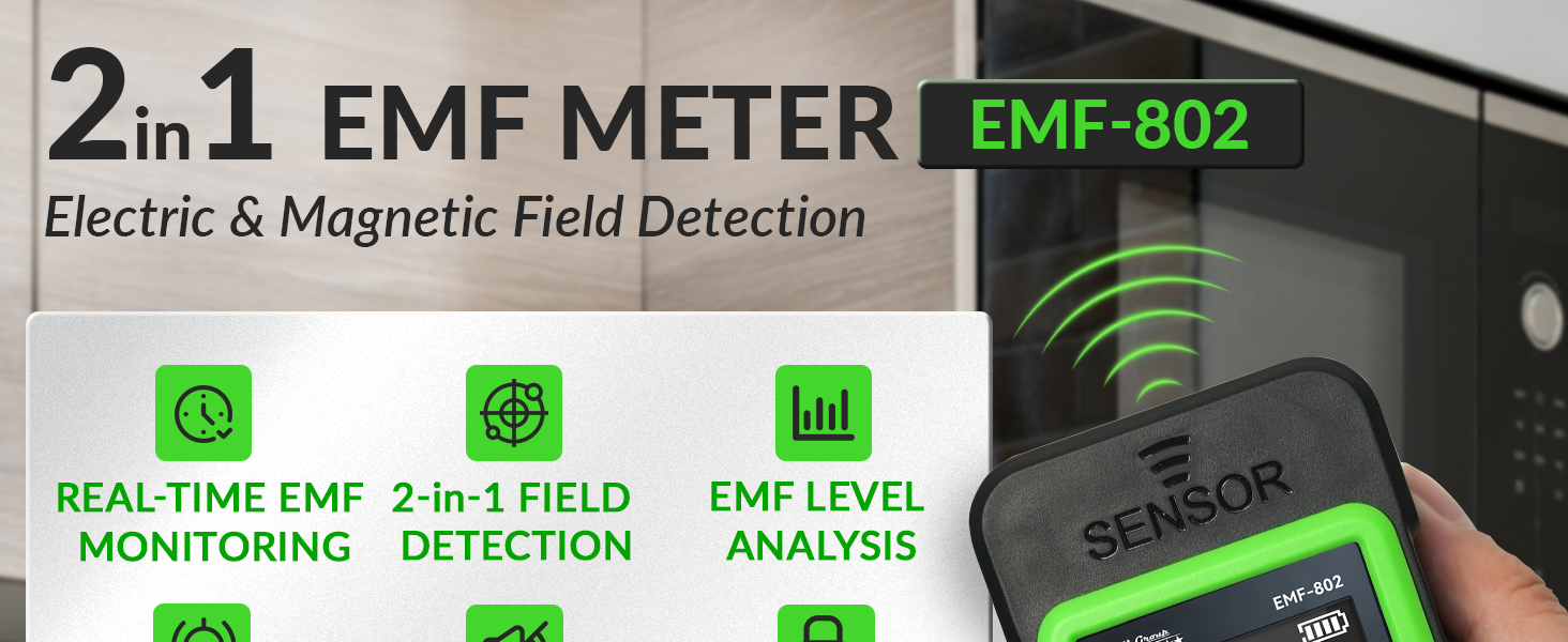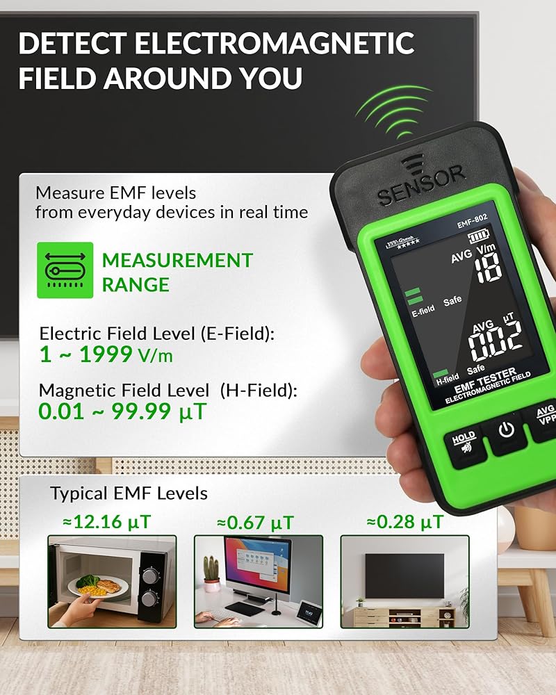 DUAL ELECTRIC & MAGNETIC FIELD DETECTION - Measures electric field (1–1999 V/m) and magnetic field (0.01–99.99 μT) simultaneously to identify common EMF sources in homes and offices.