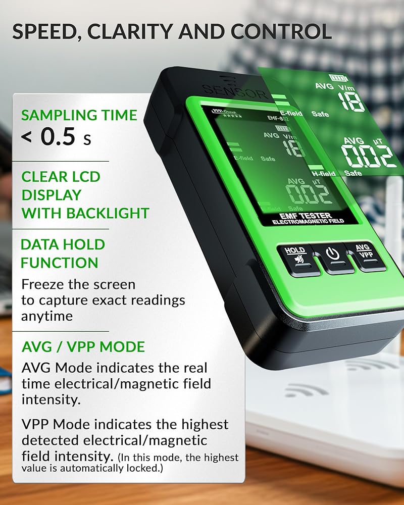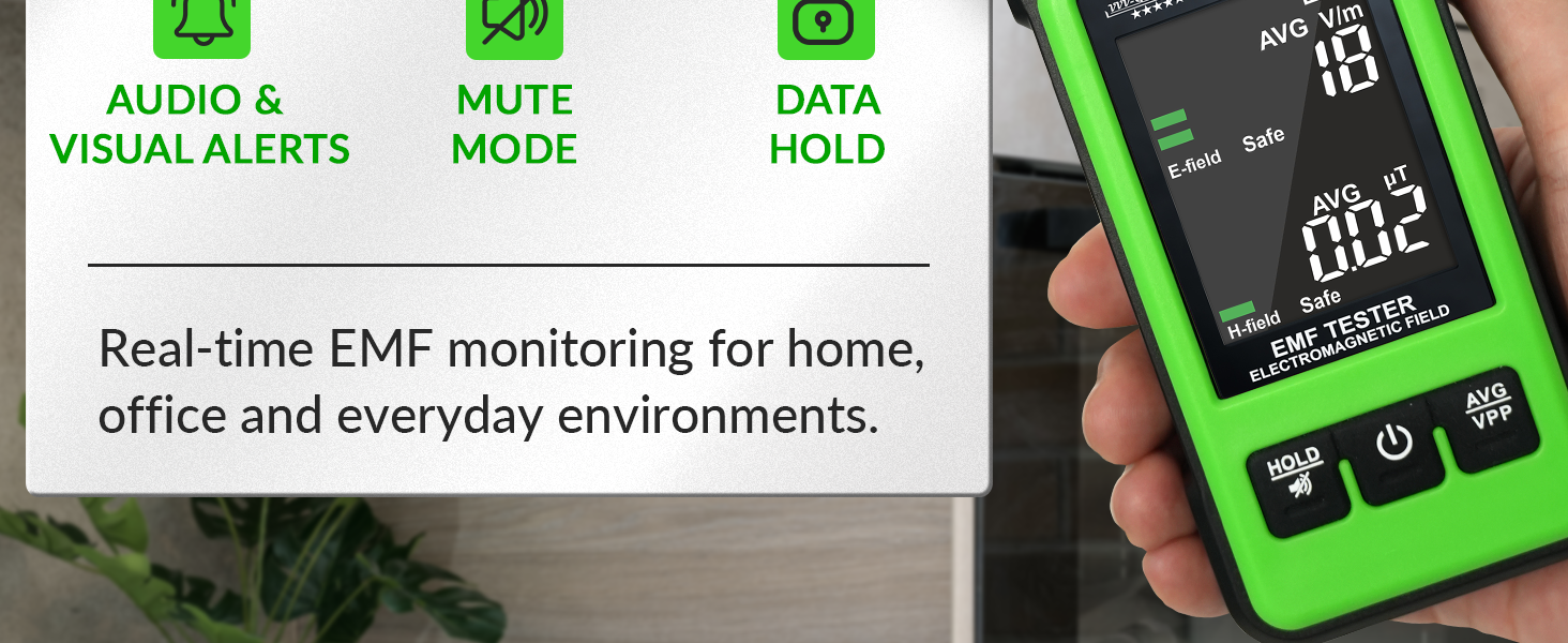 AVG & PEAK MODES FOR SIMPLE MONITORING - Average mode shows live conditions, while Peak mode captures the highest detected value — useful for locating stronger EMF sources.