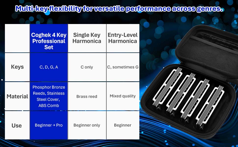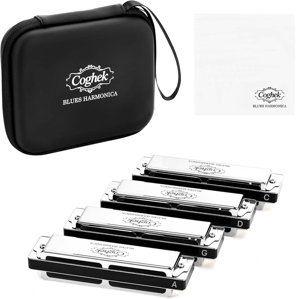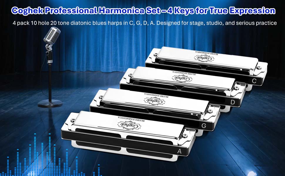 Coghek harmonica set includes 4 professional 10 hole 20 tone blues harps in keys C G D A, delivering full range sound for practice, studio sessions, jam nights, and stage performance