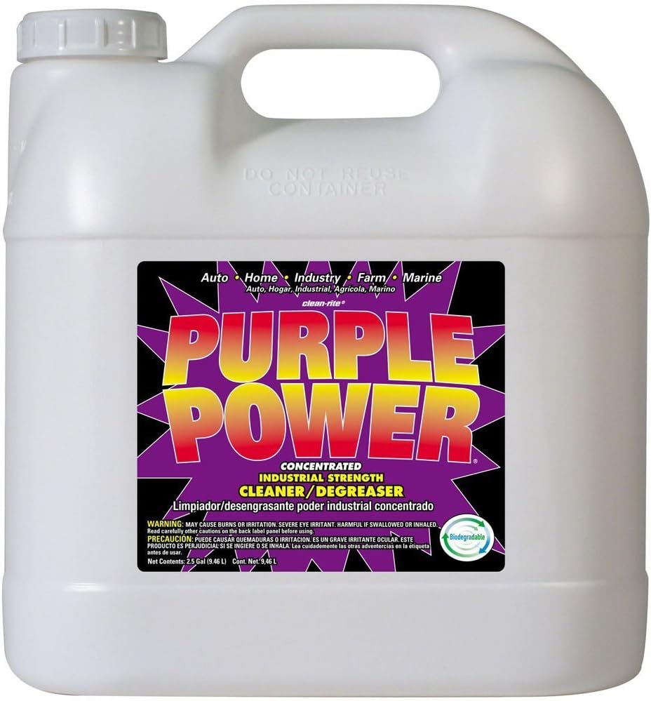 Power away dirt and grease on contact. Rely on Purple Power for the toughest cleaning jobs. Purple Power industrial strength cleaner/degreaser works great on a wide variety of surfaces in auto, farm, marine, home and industrial applications. The concentrated formula penetrates quickly and then creates a barrier between the stain and the surface being cleaned. Biodegradable, non-abrasive, non-flammable, and phosphate-free. Directions: Test an out-of-site area to determine surface acceptance and colorfastness to avoid damaging surfaces, especially on aluminum, painted surfaces and fabrics. Wear rubber gloves, protect eyes and skin from direct contact. Use with adequate ventilation. Cover surface with Purple Power, allowing time to dissolve dirt and grease. Do not allow drying on surface being cleaned. Rinse with water. Do not use on exterior car surfaces, glass, painted surfaces, or wheel rims.