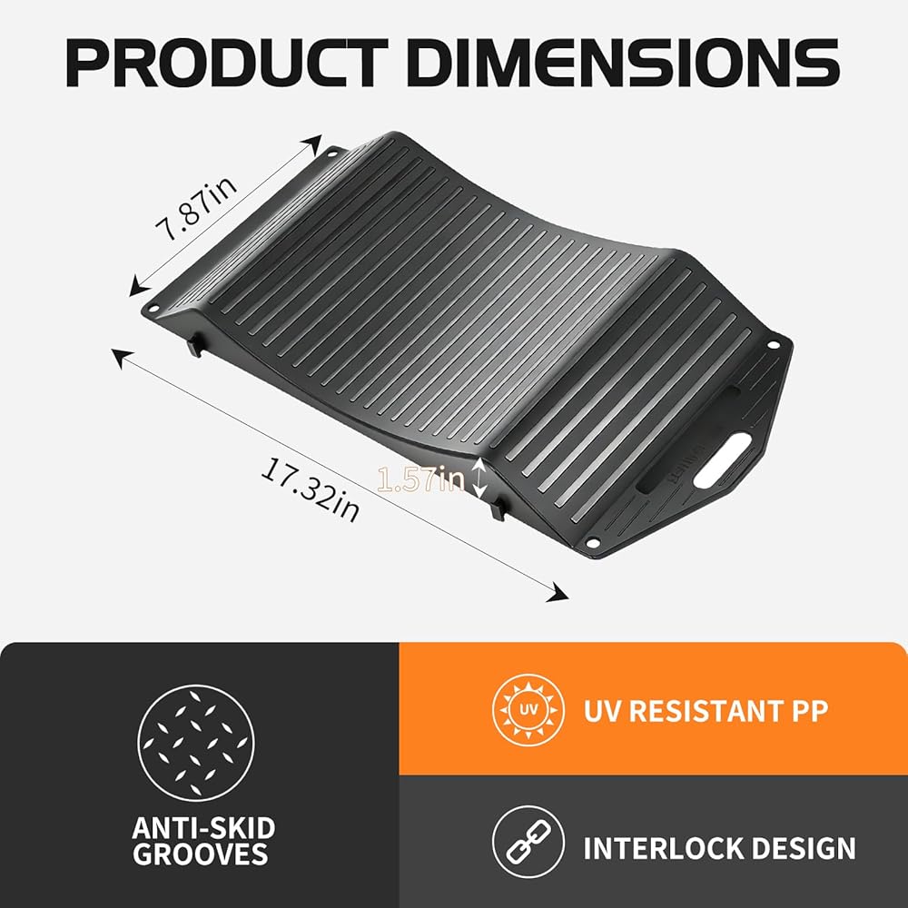 INTERLOCK DESIGN & ANTI-SLIP PADS:Features interlocking tabs to create custom platforms for wide tires, plus anti-slip pads and pre-drilled holes for secure ground fastening.