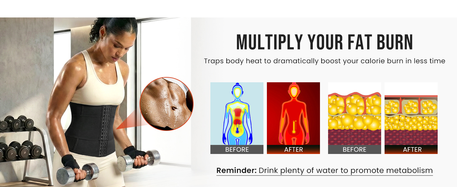 Thermal Sauna Effect Around Your Core: The inner layer of waist trainer for women is designed with heat-activated fabric to reflect and circulate warmth around your waist, this waist trainer for women belly fat helps raise your core temperature quickly, promoting intense localized sweating during workouts to facilitate your waist-slimming and core muscle enhancement