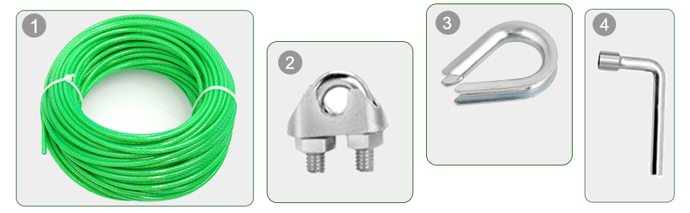 Simple Installation: Firstly, cut custom length for your need. Then steel cable with thimbles pass eye hooks or turnbuckles eye. At last fasten using U bolt saddle fasteners w/ attached screwdriver easily. Removable and reusable