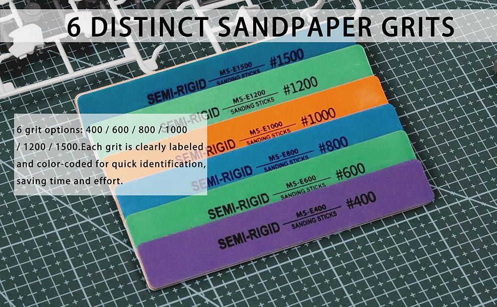 Six Useful Grit Levels: Includes 400, 600, 800, 1000, 1200, and 1500 grit sandpaper, each labeled and color-coded for quick identification, allowing a smooth progression from rough shaping to fine polishing for clean, detailed results