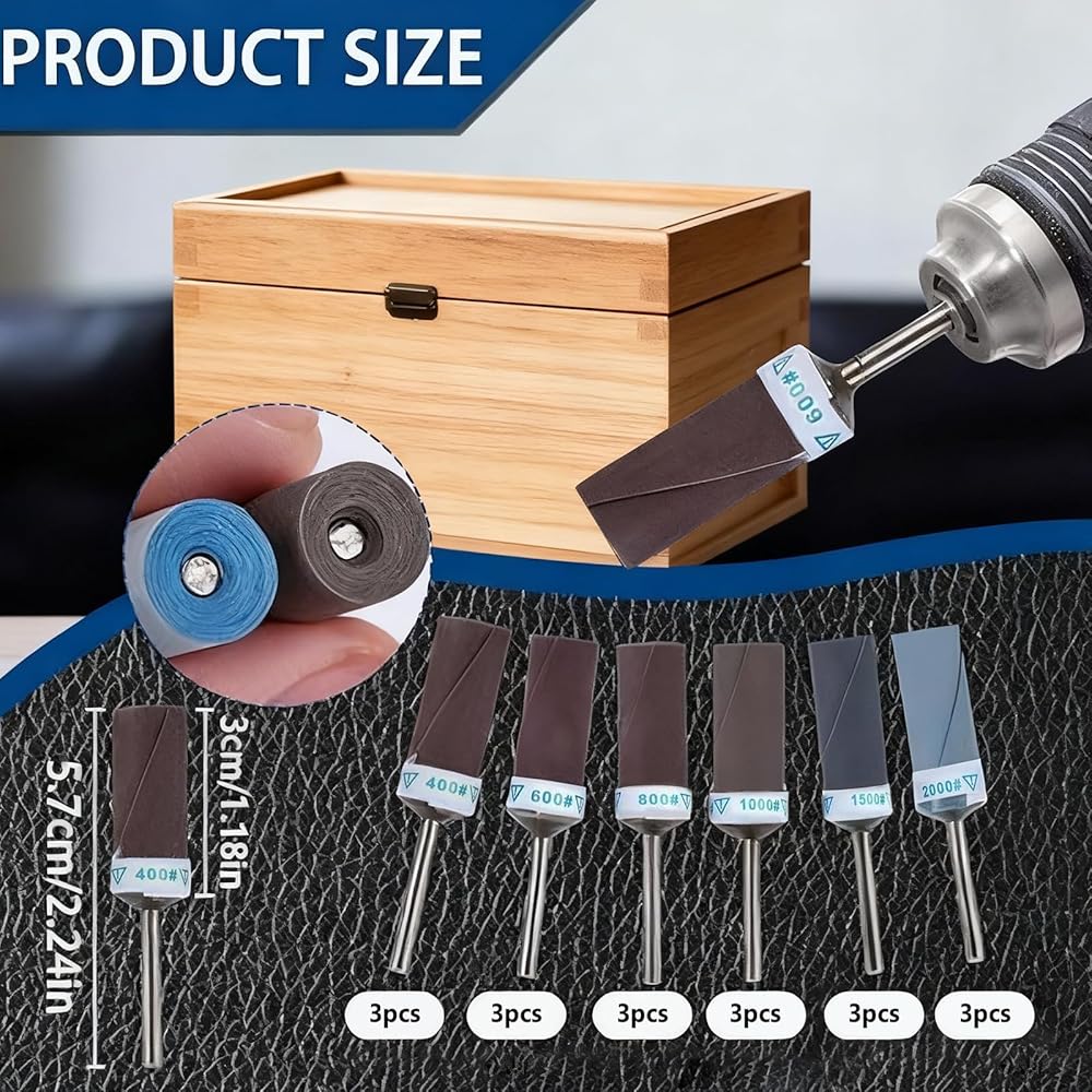 【Comprehensive 18-Piece Kit】Upgrade your workspace with this complete set featuring 18 high-performance dremel sanding drums (3 each of 400/600/800/1000/1500/2000 grit) stored in a durable case. Perfect as dremel tool accessories for detailed material processing.