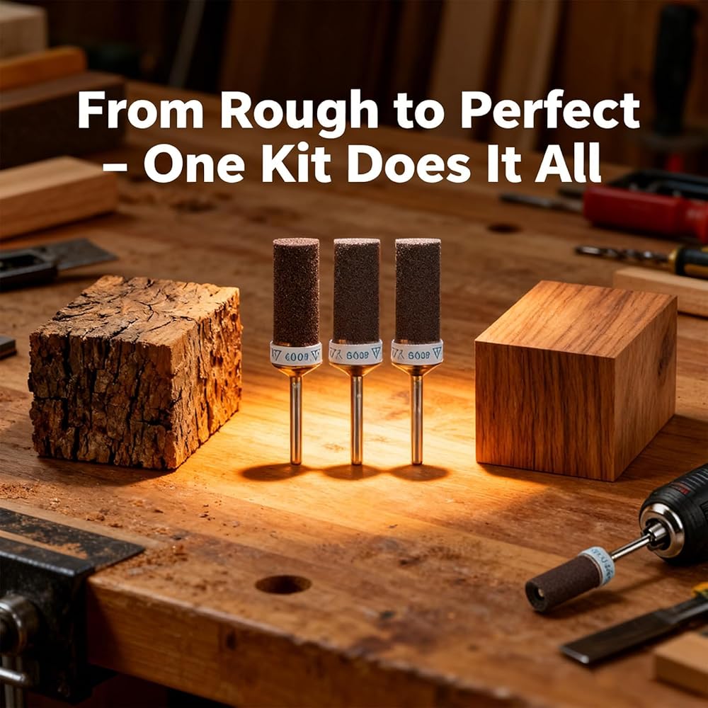 【Multi-Material Mastery】Effortlessly handle wood carving, metal deburring, jewelry polishing, and plastic smoothing. Our sanding bits transition seamlessly between rough shaping (400 grit) and mirror finishing (2000 grit) on curved surfaces.