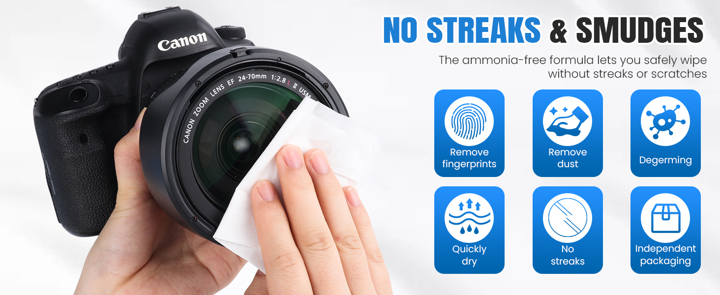 【Effective Cleaning】VOISEN lens cleaning wipes with innovative formula that help gently and effectively remove dirt, dust and fingerprints from Eye Glasses, Sunglass, Phones,Camera Lens, Goggles.etc.The wipes don't have an overabundance of moisture,not dripping wet,but moist enough to provide a good cleaning effect. If you prefer a bit moister wipe, please do not order.