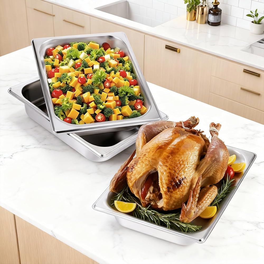 Versatile Use: Ideal for half pans for chafing dishes for buffet, these 6-pack stainless steel half pan chafing dish options can be used for baking, steaming, and serving a variety of dishes, including lasagna, chicken, and brownies.