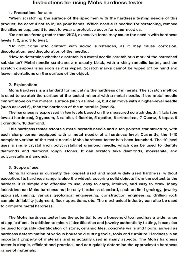 【Full 1-10 Mohs Hardness Range】Accurately measures hardness levels from 1 (talc) to 10 (diamond), covering all standard mineral and rock types.