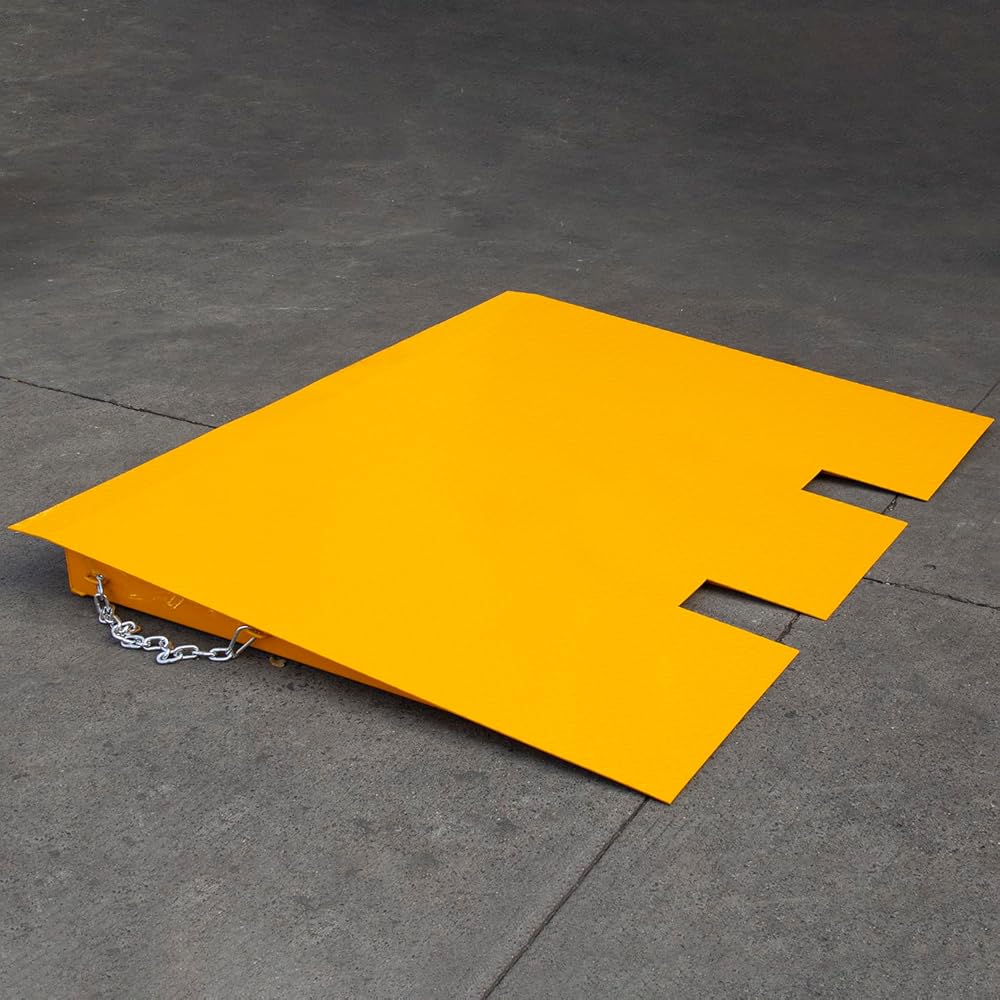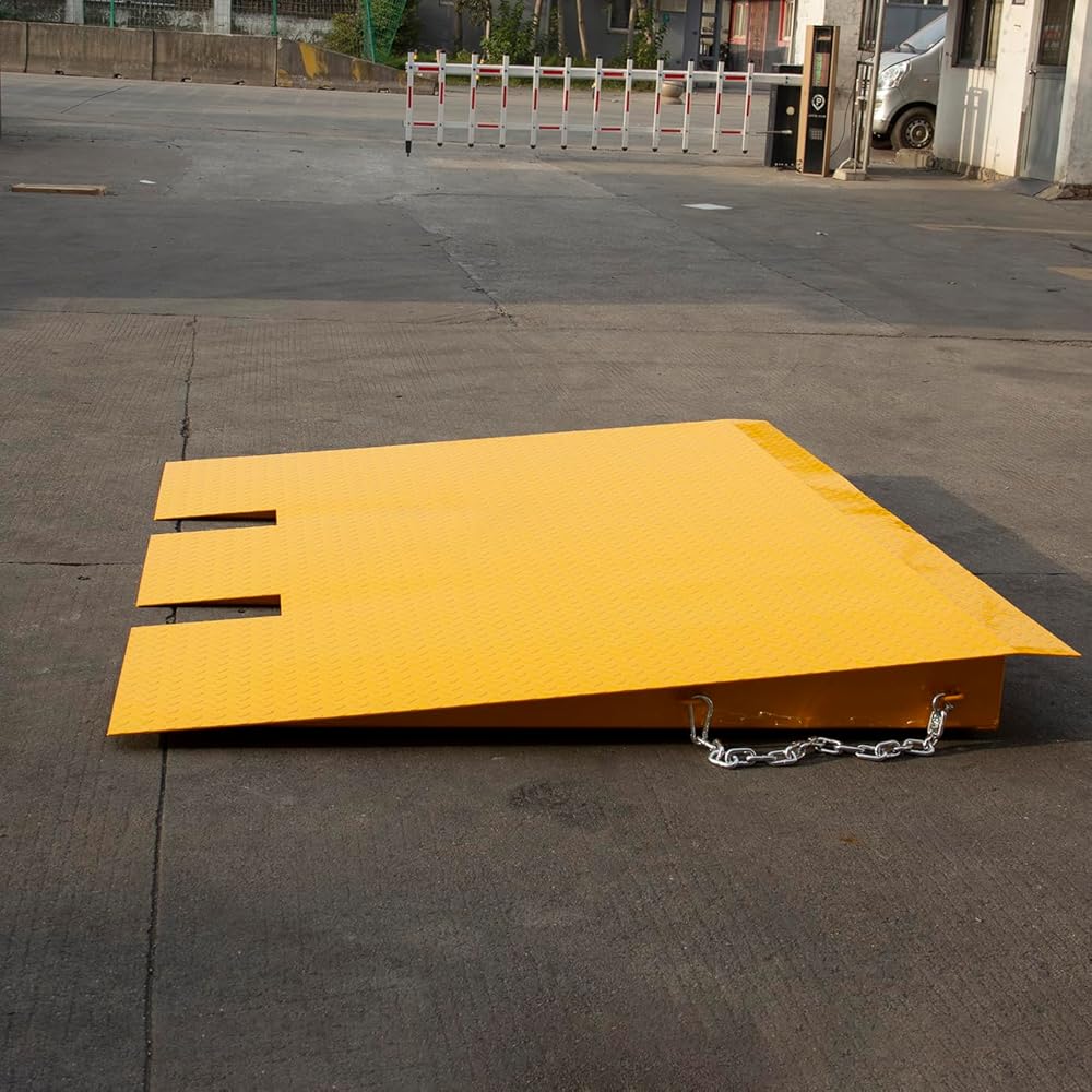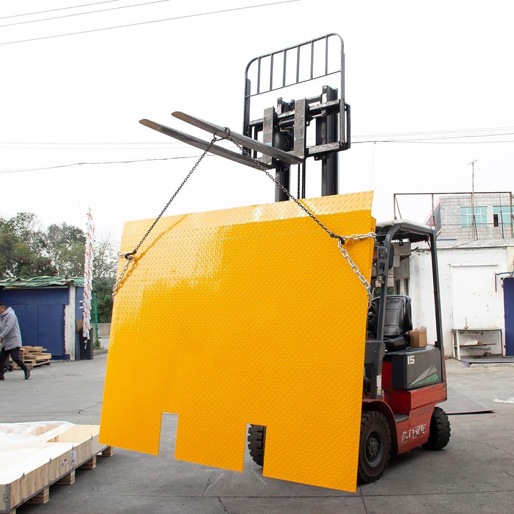 The Heavy Duty Shipping Container Ramp is a professional-grade steel loading ramp engineered to simplify and secure material handling between shipping containers, docks, and warehouse floors. Made from reinforced diamond plate steel, this container dock ramp delivers exceptional load-bearing strength with a 16,000 lb capacity, making it suitable for forklifts, pallet jacks, dollies, and heavy cargo equipment. This forklift-compatible container ramp features integrated lifting chains with safety hooks, allowing operators to easily move, position, and secure the ramp during operation. The all-welded steel construction ensures long-term durability for indoor and outdoor use, even in harsh industrial conditions. Perfect for warehouses, logistics hubs, shipping docks, container storage units, and industrial facilities, the container loading ramp delivers strength, safety, and efficiency where heavy-duty performance matters most.