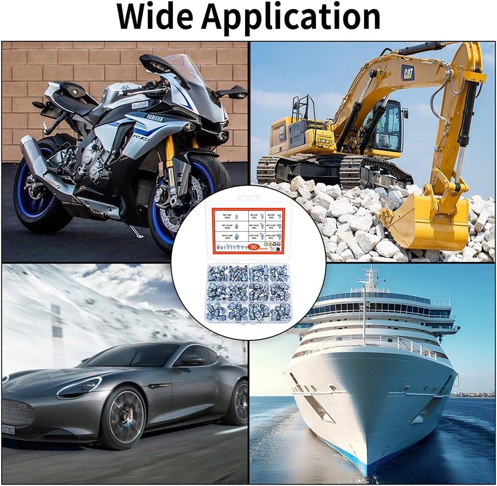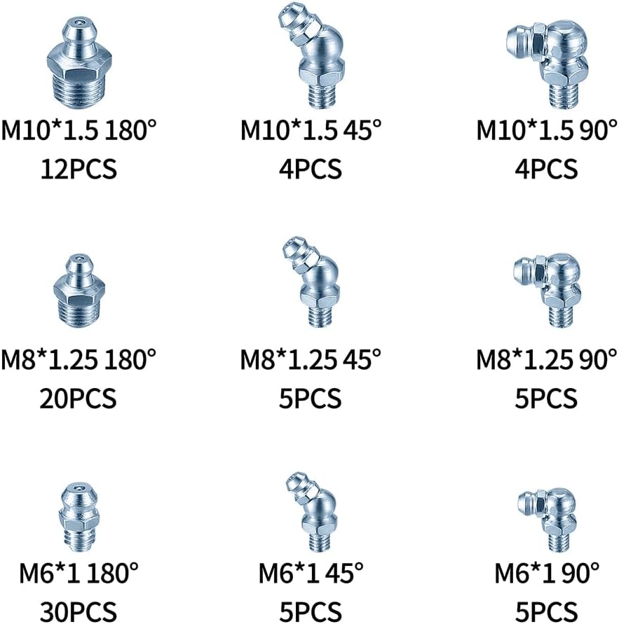 Product Information - Product Name: Grease Fitting Assortment Set - Material: metal - Size: As shown - Quantity: 90 pieces Package Includes: 5 Pcs - M6 45° 5 Pcs - M6 90° 30 Pcs - M6 180° 5 Pcs - M8 45° 5 Pcs - M8 90° 20 Pcs - M8 180° 4 Pcs - M10 45° 4 Pcs - M10 90° 12 Pcs - M10 180° Features: - These grease fittings are made of high quality metal material, which is sturdy and durable. - All high pressure grease nipples are packed in a storage box, easy to use, find and carry. - Suitable for most automotive, motorcycle, truck, agricultural and industrial applications etc. - Fixed incompatibility issues with straight, 90 degree and 45 degree adjustments. Warm Tips - Color may vary slightly from the online image due to your monitor colour settings, please refer to the actual product, thank you for your understanding. - If you have any questions about how to use the grease fitting assortment kit, please feel free to contact us. We will solve your questions as soon as possible.Thank you for your support.