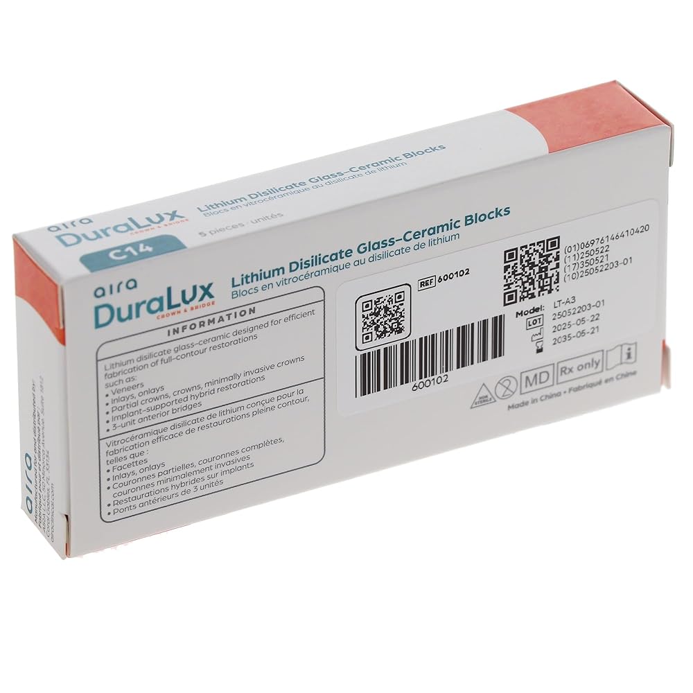Aira 600102 DuraLux IPS e.max Type Blocks CAD inLab LT A3 C14 5/Pk. . The Aira IPS e.max Type CAD blocks are composed of reliable lithium disilicate glass-ceramic, well-known for providing an exceptional balance between high flexural strength and natural, tooth-like esthetics. This particular block configuration is carefully engineered to achieve the optimal combination of opacity and natural appearance required for full-contour restorations like crowns and veneers.