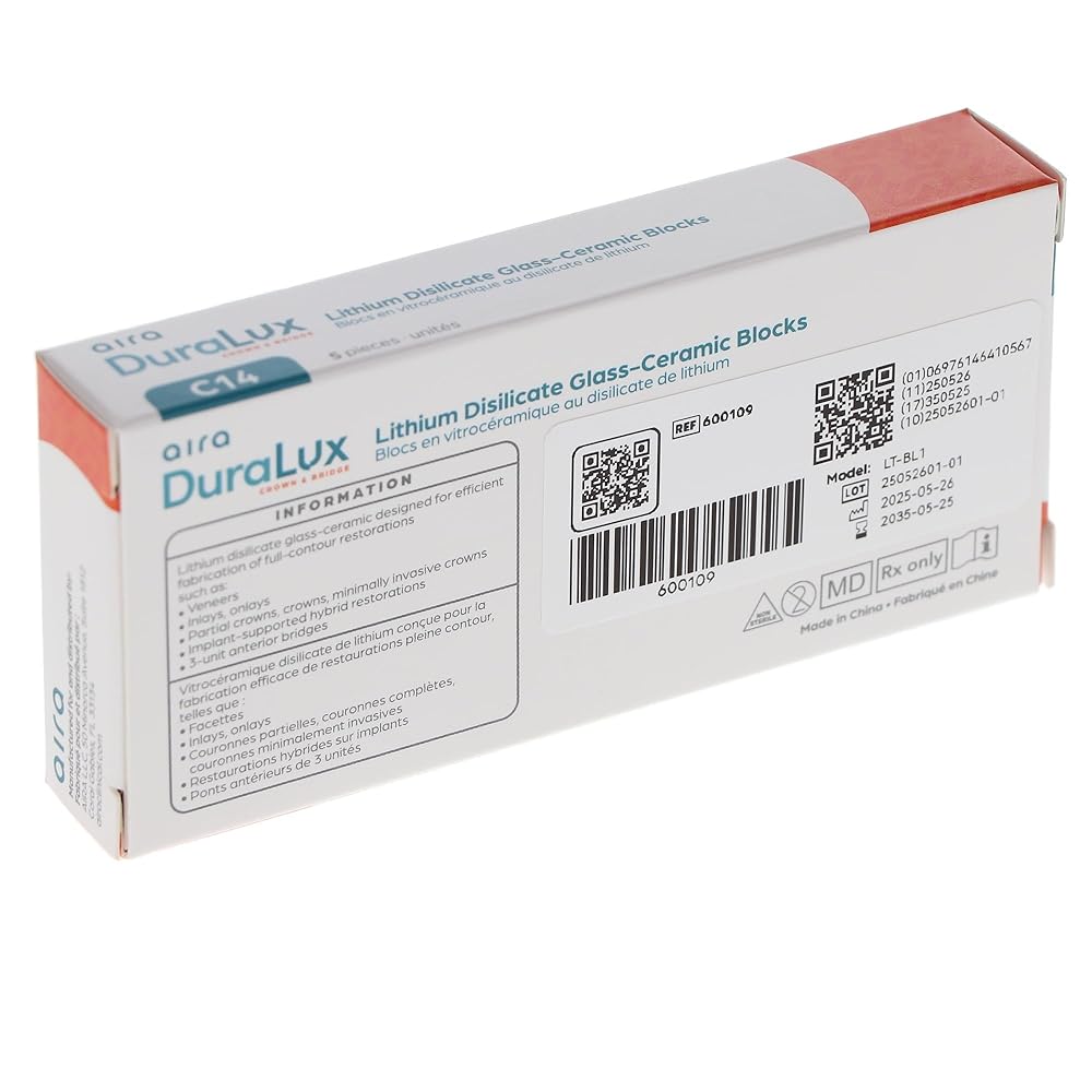 Aira 600109 DuraLux IPS e.max Type Blocks CAD inLab LT BL1 C14 5/Pk. . The Aira IPS e.max Type CAD blocks are composed of reliable lithium disilicate glass-ceramic, well-known for providing an exceptional balance between high flexural strength and natural, tooth-like esthetics. This particular block configuration is carefully engineered to achieve the optimal combination of opacity and natural appearance required for full-contour restorations like crowns and veneers.