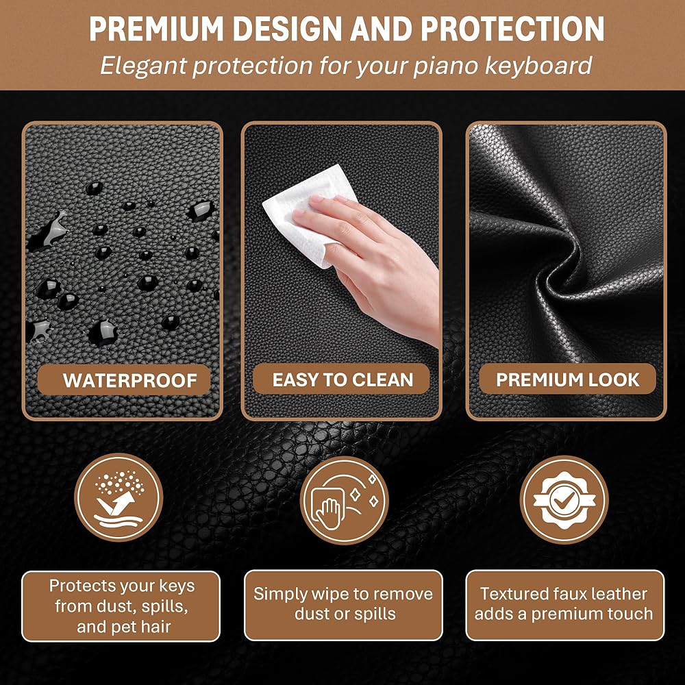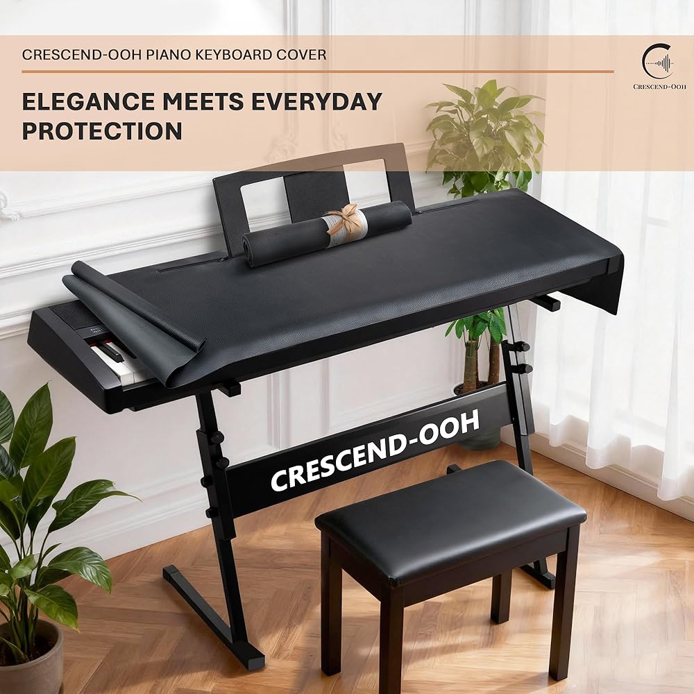 Give your piano the care and style it deserves with Crescend-ooh's Piano Keyboard Dust Cover - a luxurious and protective design built for long-lasting use. Measuring 67" x 16" for optimal coverage, this black faux leather cover fits 61–88-key digital and electric keyboards, combining elegance with everyday practicality and protection. The premium textured faux leather adds a sophisticated touch to any space. The realistic leather surface looks stunning and feels high-end, making it a stylish piano accessory for both adults and kids. Whether your piano sits in the living room or a teaching studio, Crescend-ooh's timeless design blends beautifully with any decor. Crescend-ooh's cover offers a flexible fit that accommodates various 61–88-key pianos, unlike tight bags or hard cases made for specific keyboard models. The extra-wide design provides added protection for both the front and back of your instrument, helping it stay clean and dust-free between every piano session. The smooth two-way plastic zipper makes it easy to fit the cover over music stands up to 31.5" wide. This detail keeps your keyboard fully covered without removing the stand, while the durable plastic zipper prevents scratches and metal contact. The simple design also makes it quick to remove and roll up for convenient storage. Crescend-ooh's protective keyboard cover shields your instrument from dust, water, and pet hair while keeping your piano's electronics and parts in great condition. Ideal for homes with pets or busy spaces, it ensures your keyboard always looks and performs its best. Inside, a soft dark-gray felt backing gently cushions your keys, protecting them from scratches and marks. The smooth lining rests safely on the keyboard surface, keeping your piano spotless and ready to play. Keep your piano looking beautiful and protected year-round with Crescend-ooh's premium faux leather keyboard cover — the perfect blend of functionality, durability, and thoughtful design.