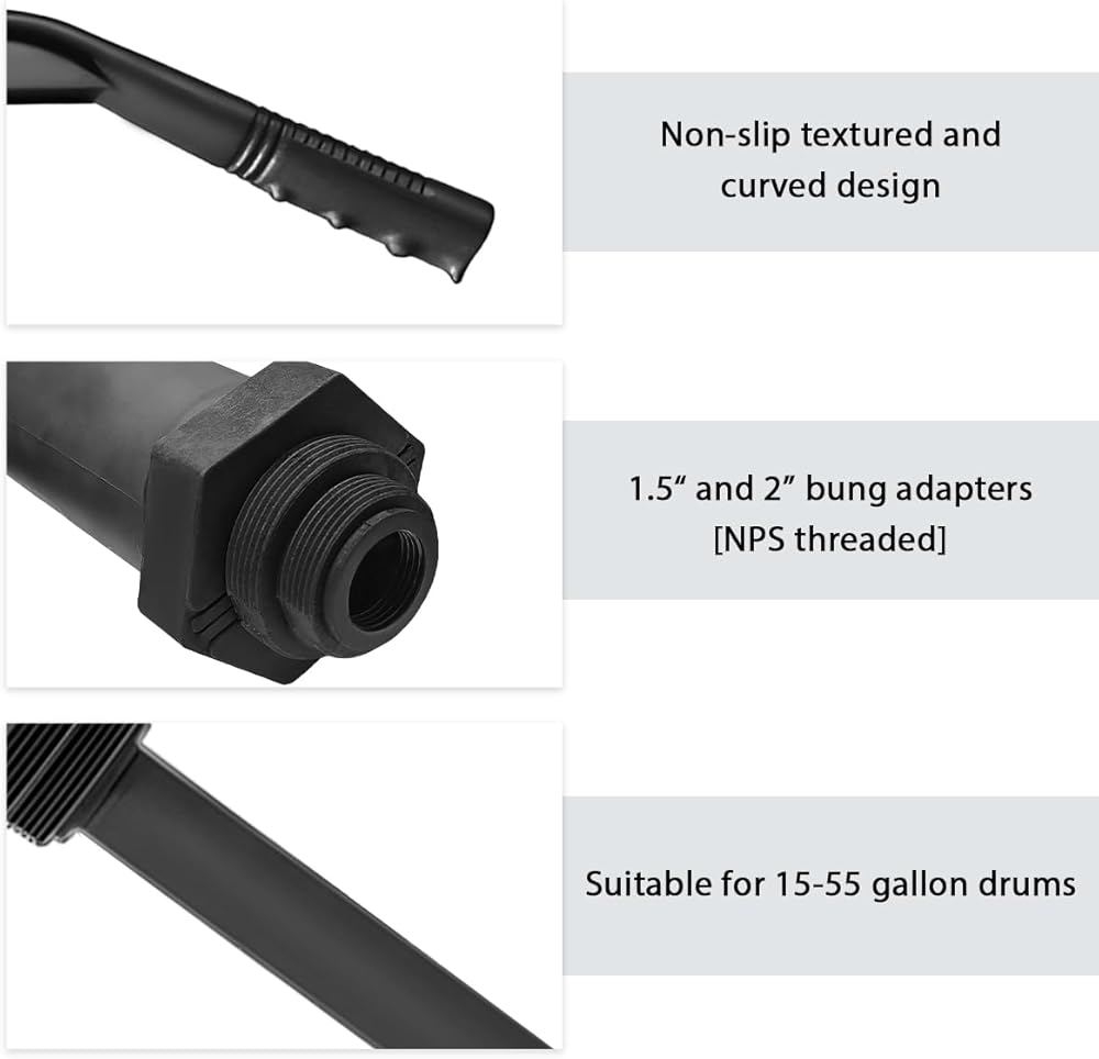 Adjustable Height: Equipped with a telescoping suction tube, the pump adjusts easily to fit 15- to 55-gallon drums. This feature ensures optimal reach and compatibility with varying container depths, avoiding fluid waste and making each transfer precise and complete