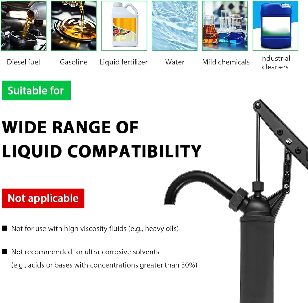 Broad Application: This hand pump is compatible with various fluid types commonly used in automotive and industrial settings, such as motor oil, transmission fluid, diesel, and cleaning solutions. It supports daily liquid handling tasks across different environments