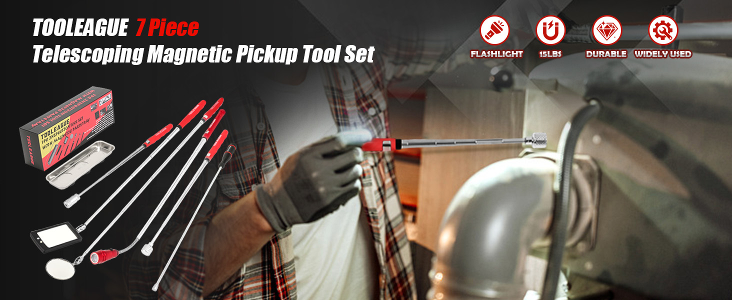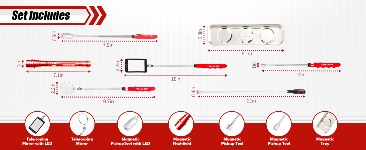 What You Get:1Pc 15 lb magnet pick up pen,1 pc 3 lb magnet snake pickup rod,1 piece round shaped inspection mirror ,1 piece square shaped inspection mirror, 1 piece telescoping flexible extensible LED flashlights and 1 rectangular magnetic tray.
