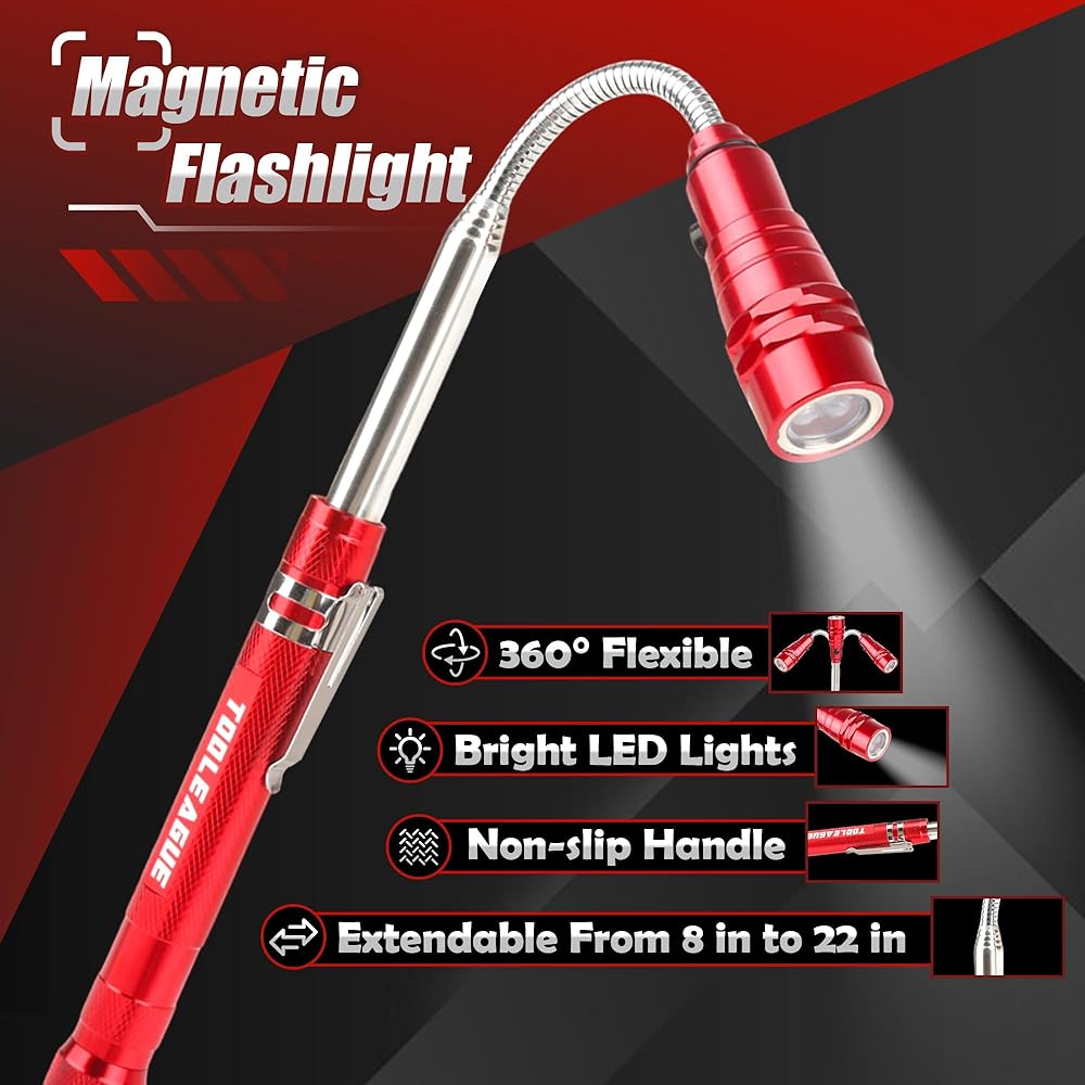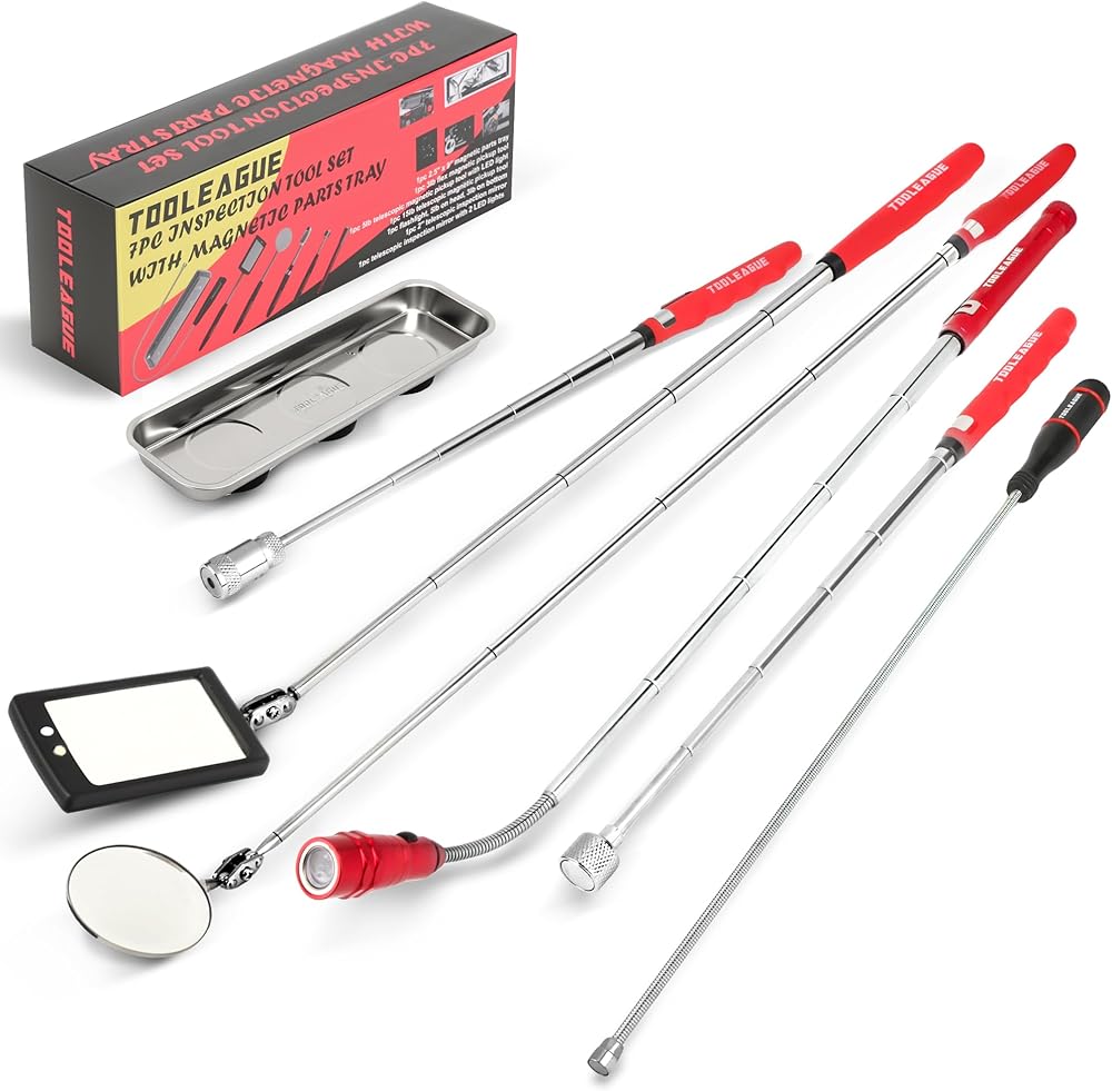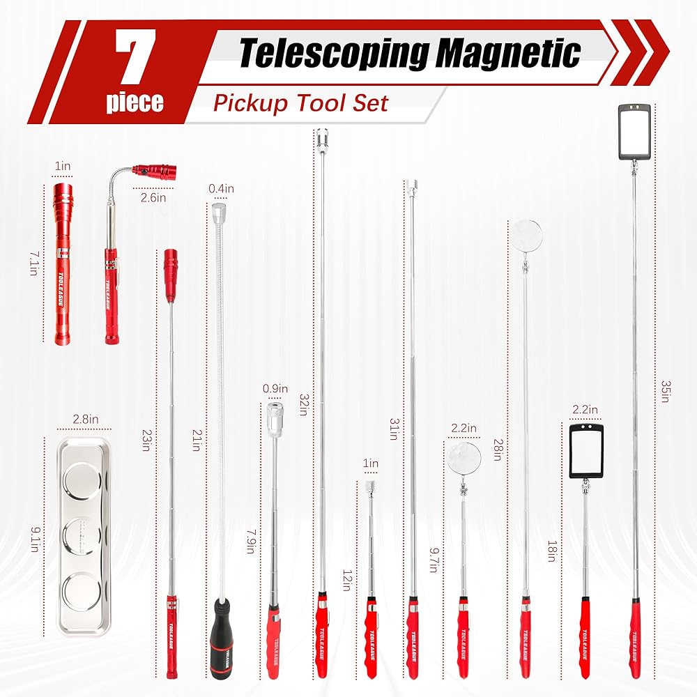 TOOLEAGUE 7Pcs Telescoping Magnetic Pickup Tool Set, Extendable LED Flashlight,Round & Square 360° Inspection Mirror for Men Mechanics, and Handymen, Red