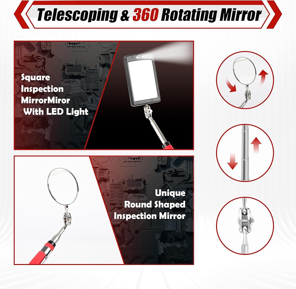 Round/ Square Inspection Mirrors:The versatile inspection mirror Made of high quality glass for clear reflection. Features a 360°ball joint for flexible viewing angles and stability. Includes round and square mirrors with LED lights for inspecting dark areas.
