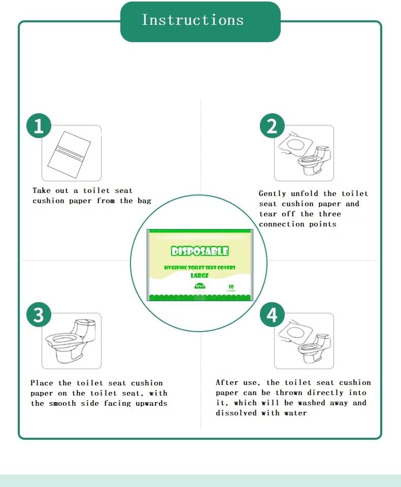 Applicable scenarios: The toilet seat cover paper can be perfectly folded into our portable packaging, suitable for travel bathrooms, camping, road trips, and even traveling on airplanes.