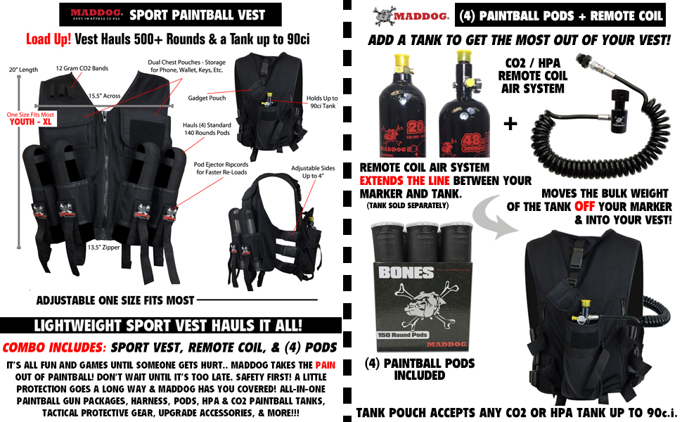 LOAD UP! Perfect Paintball Marker Accessory Combo for Your Paintball Gun! Combo includes: Lightweight Tactical Sport Vest, (4) Paintball Pods, & Upgraded Quick Disconnect Remote Coil w/ Slide Check - Compatible with CO2 & HPA Paintball Tanks! (Paintball Tank Sold Separately). Compatible with ALL Standard Paintball Guns and Paintball Tanks! - Tippmann, Empire, Dye, Azodin, HK Army, Etc. Perfect paintball accessory for woodsball, scenario, etc! Get in the game with Maddog!