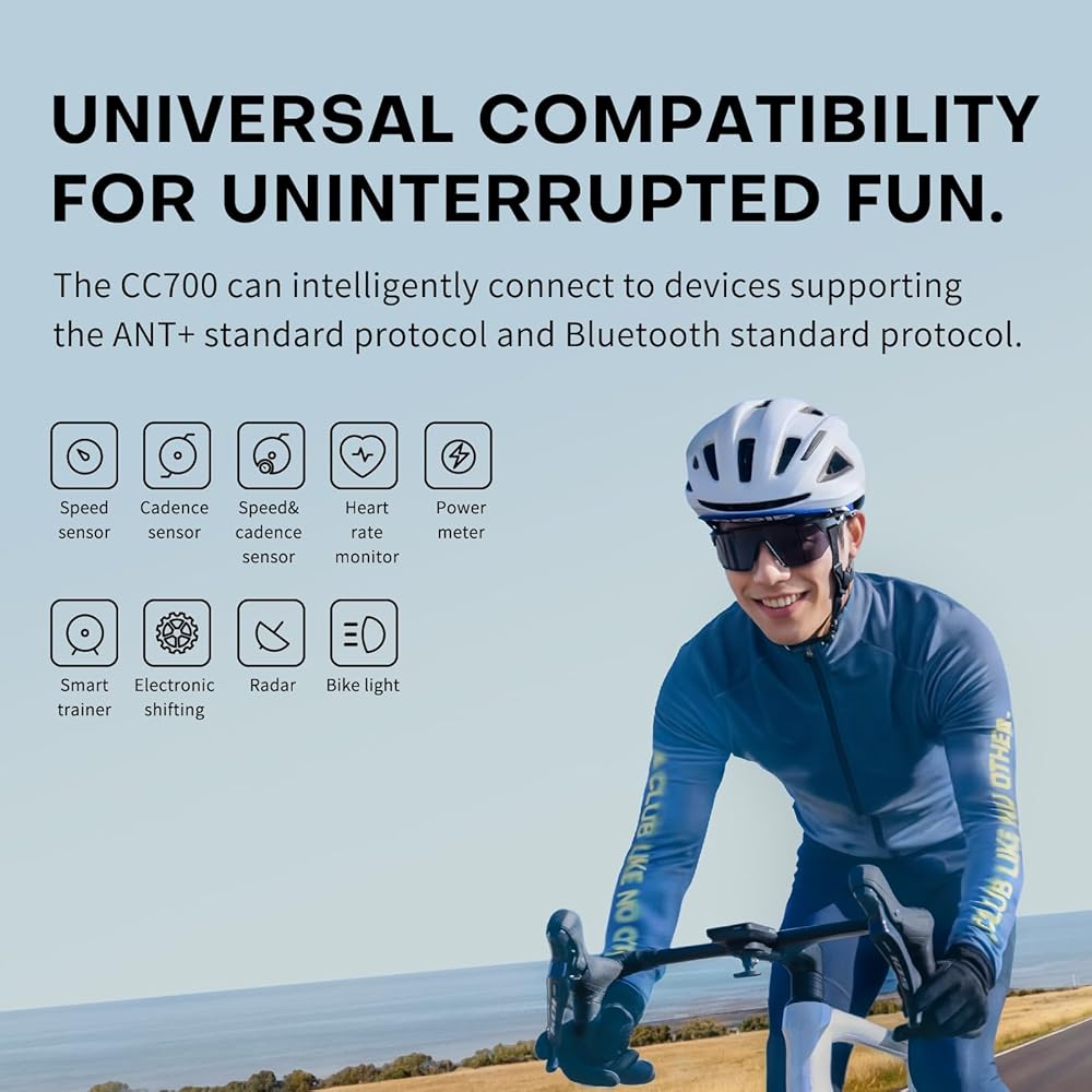 Free Indoor Training to Enhance Your Power Performance: The CC700 supports indoor training with a smart trainer, allowing you to customize power targets, resistance levels, and gradients. Focus entirely on improving your performance without external factors like weather or road conditions affecting your training pace