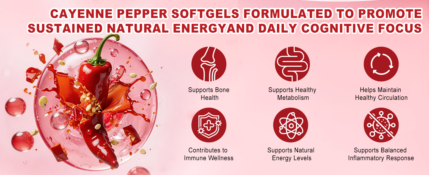 🌶️Comprehensive 12-Plant Formula for Daily Wellness: Each serving of our Cayenne Pepper Softgels combines organic cayenne pepper, beetroot, turmeric, hawthorn, grape seed, and essential vitamins D3, K2, and E to promote natural energy, vitality, and circulatory health.