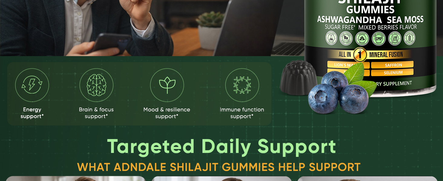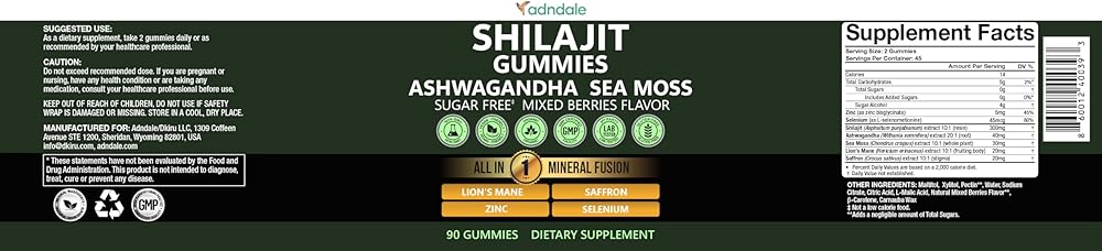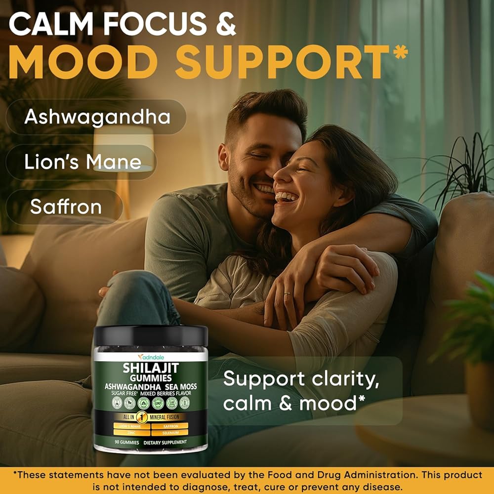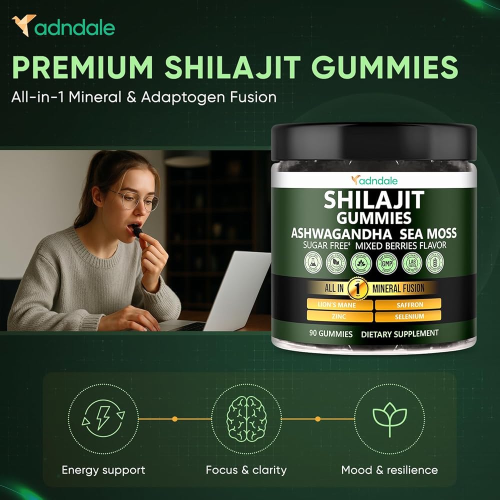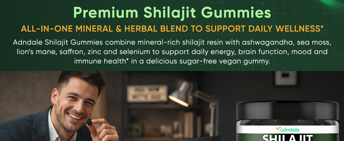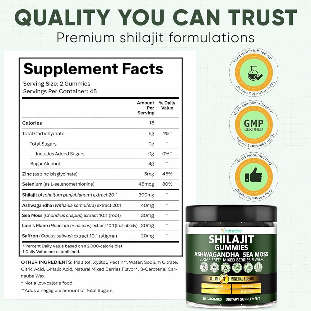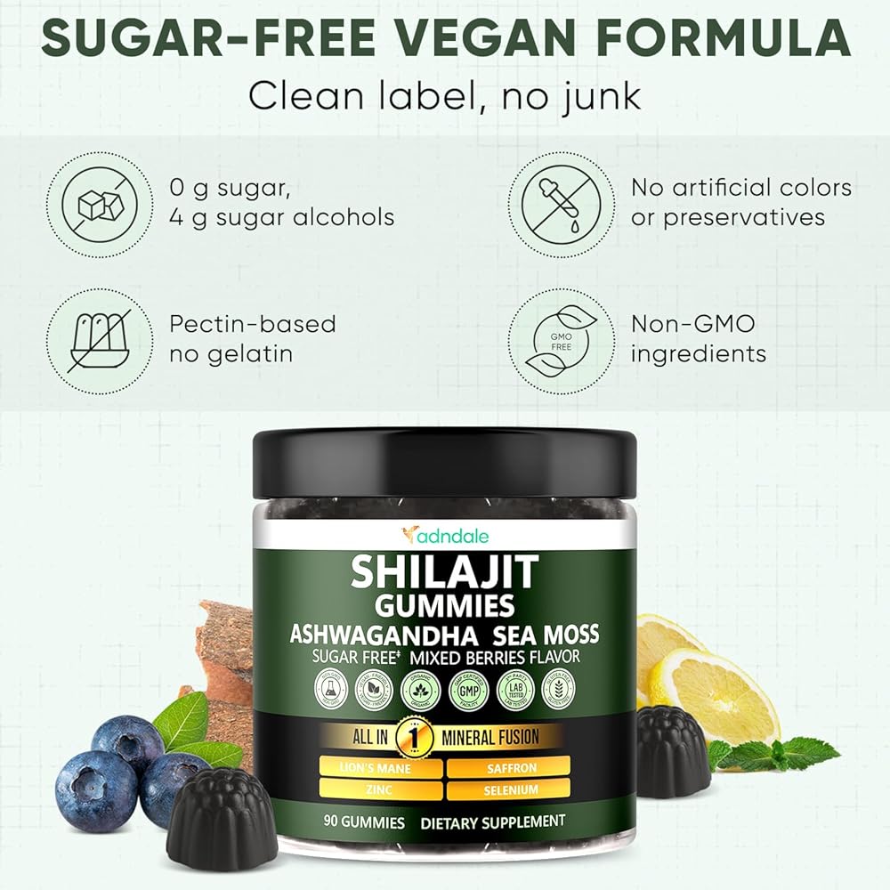 HIMALAYAN NATURAL SHILAJIT GUMMIES FOR MEN & WOMEN. A daily 7-in-1 herbal wellness blend featuring Natural Himalayan Shilajit with Ashwagandha, Sea Moss, Lion's Mane, Saffron, Zinc and Selenium. These convenient Shilajit gummies offer a routine-friendly alternative to resin or capsules for adults looking to support overall well-being