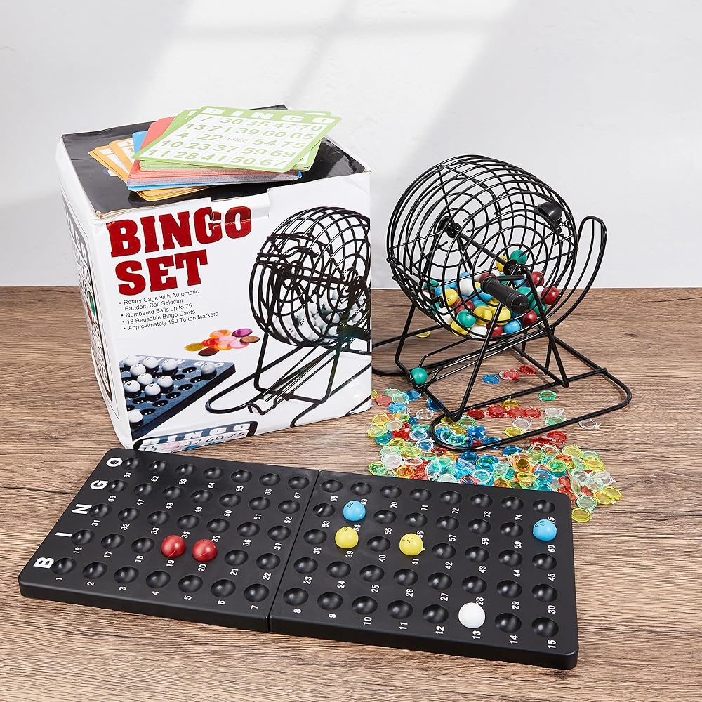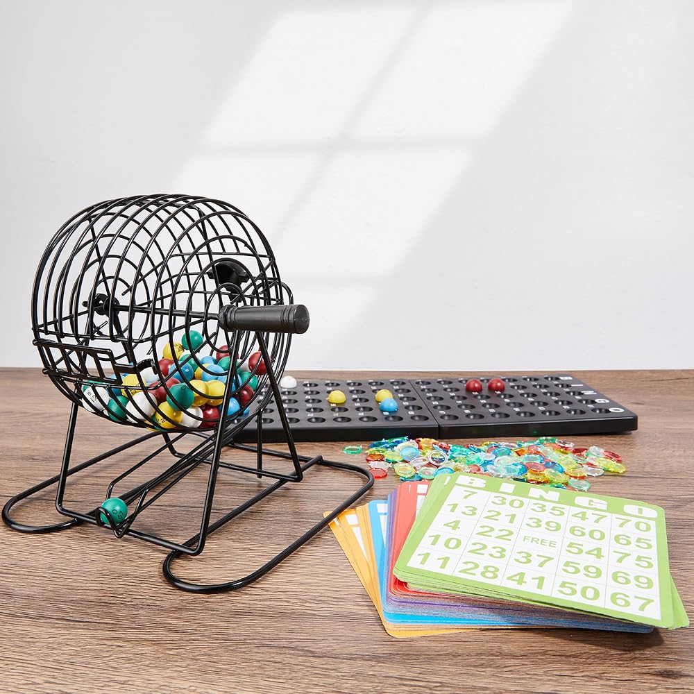 Complete Bingo Set: Everything included for instant play: 6" steel bingo cage, 75 balls, 50 cards, 300 chips, and master board. Premium bingo supplies in one box.