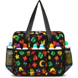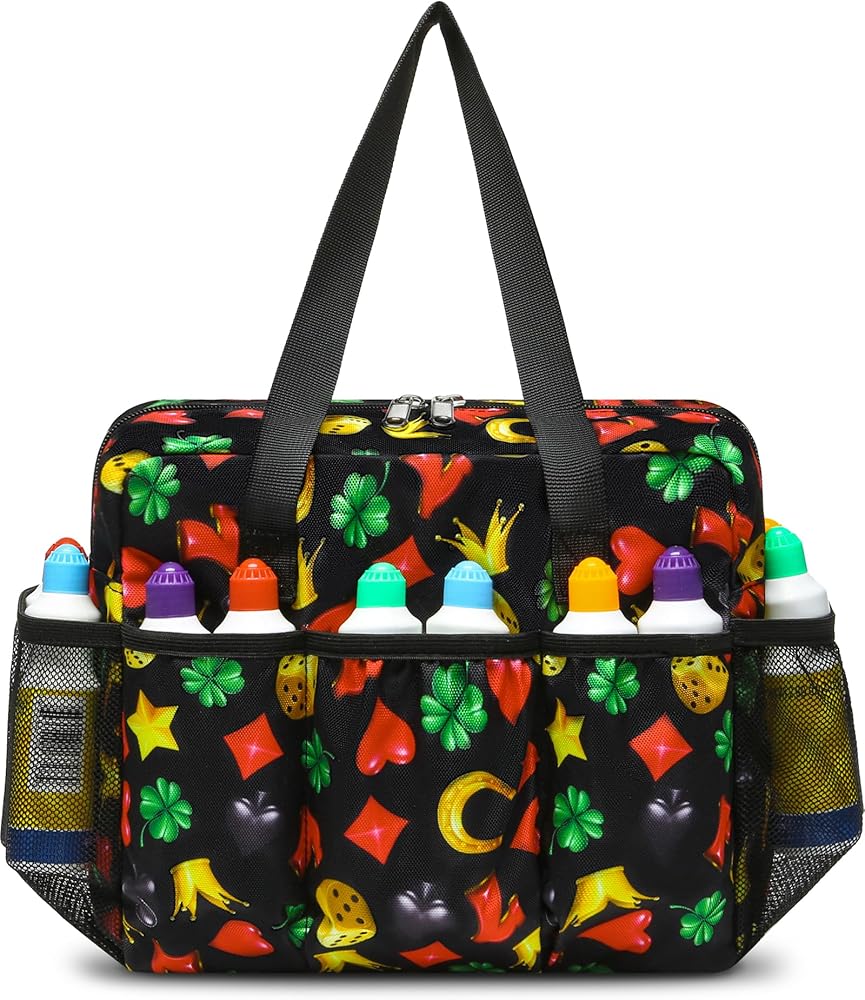 This bingo bag is roomy enough to hold 14 to 18 bingo daubers, with extra space for bingo cards, scorecards, highlighters, tape, lucky charms, phones, wallets, tissues, keys, glasses, pens, pads, and other bingo supplies and personal items. It's a handy companion for your bingo night.