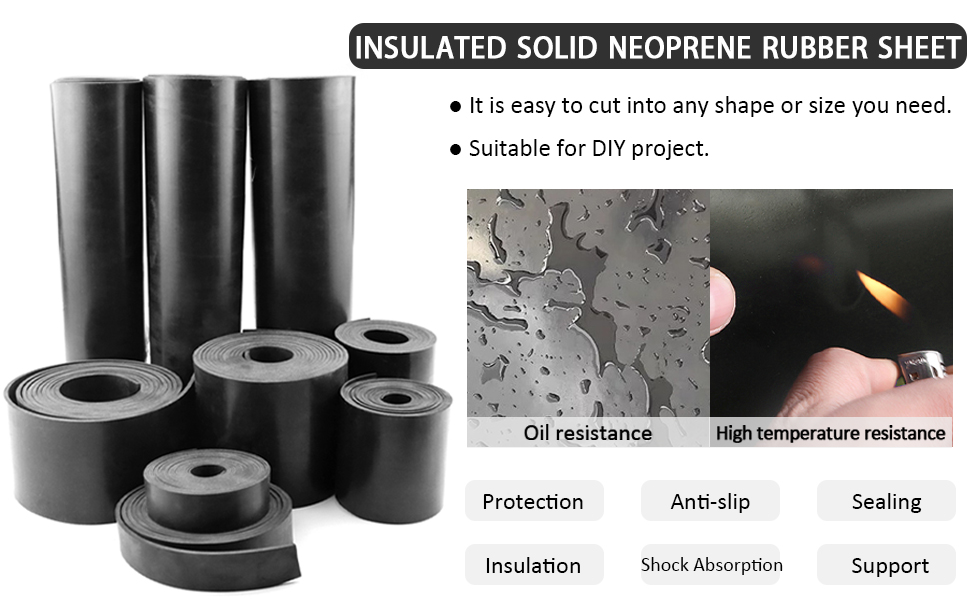 Solid Rubber Sheets, Rolls & Strips: 4" Wide x 1/8" Thick x 10' Long. This rubber sheet is made of insulating material neoprene and smooth surfaces on both sides, good flexible, wear-resistant and tear-resistant, aging resistance and long-lasting
