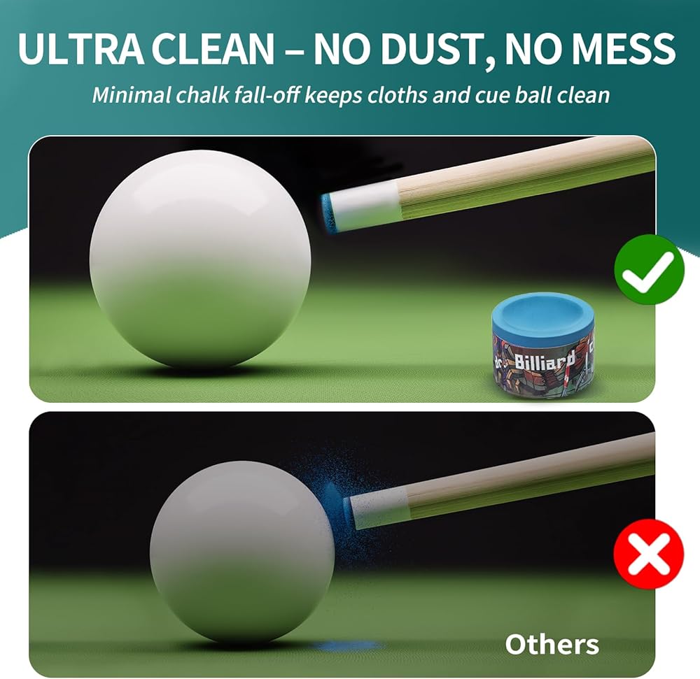 Fine Texture, Less Mess: Ultra-fine chalk minimizes residue on cue ball and table cloth. Cue chalk resists flaking and spreading, making it cleaner and healthier