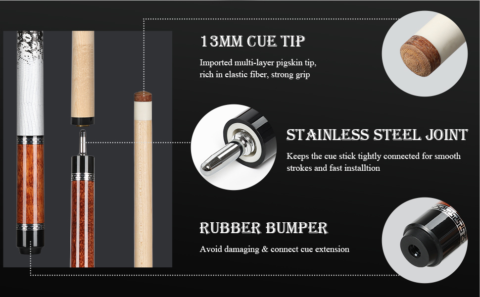 【PROFESSIONAL POOL CUE】The pool cue measures 58 Inch length and 20 Oz weight, it adopts 13mm multi-layered pigskin tip with premium fiber ferrule,Prerry strong Impact resistance and stable stroke power.