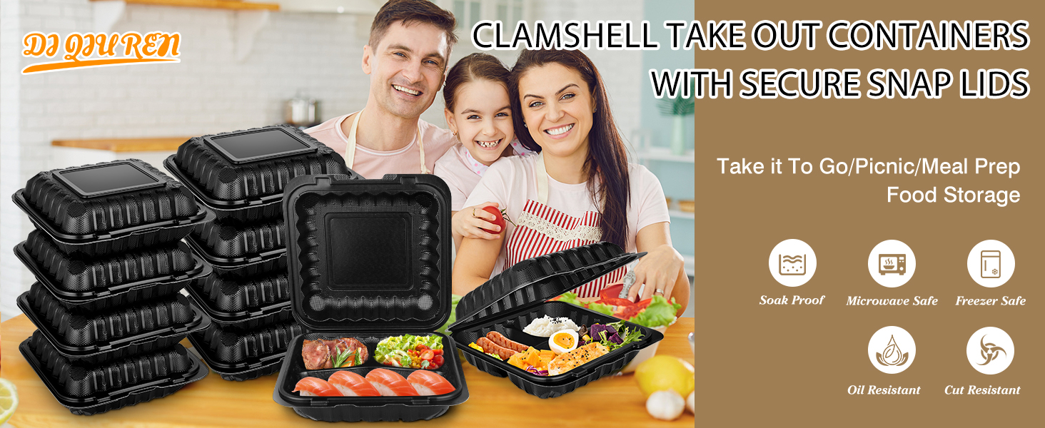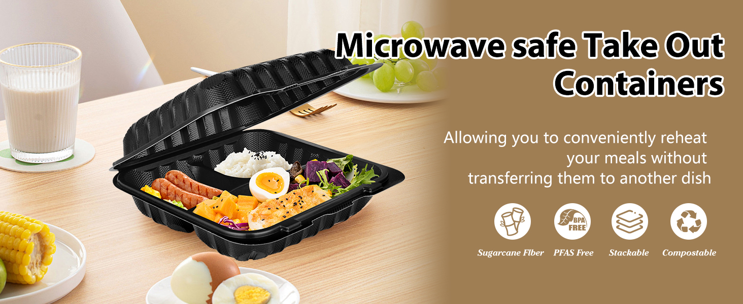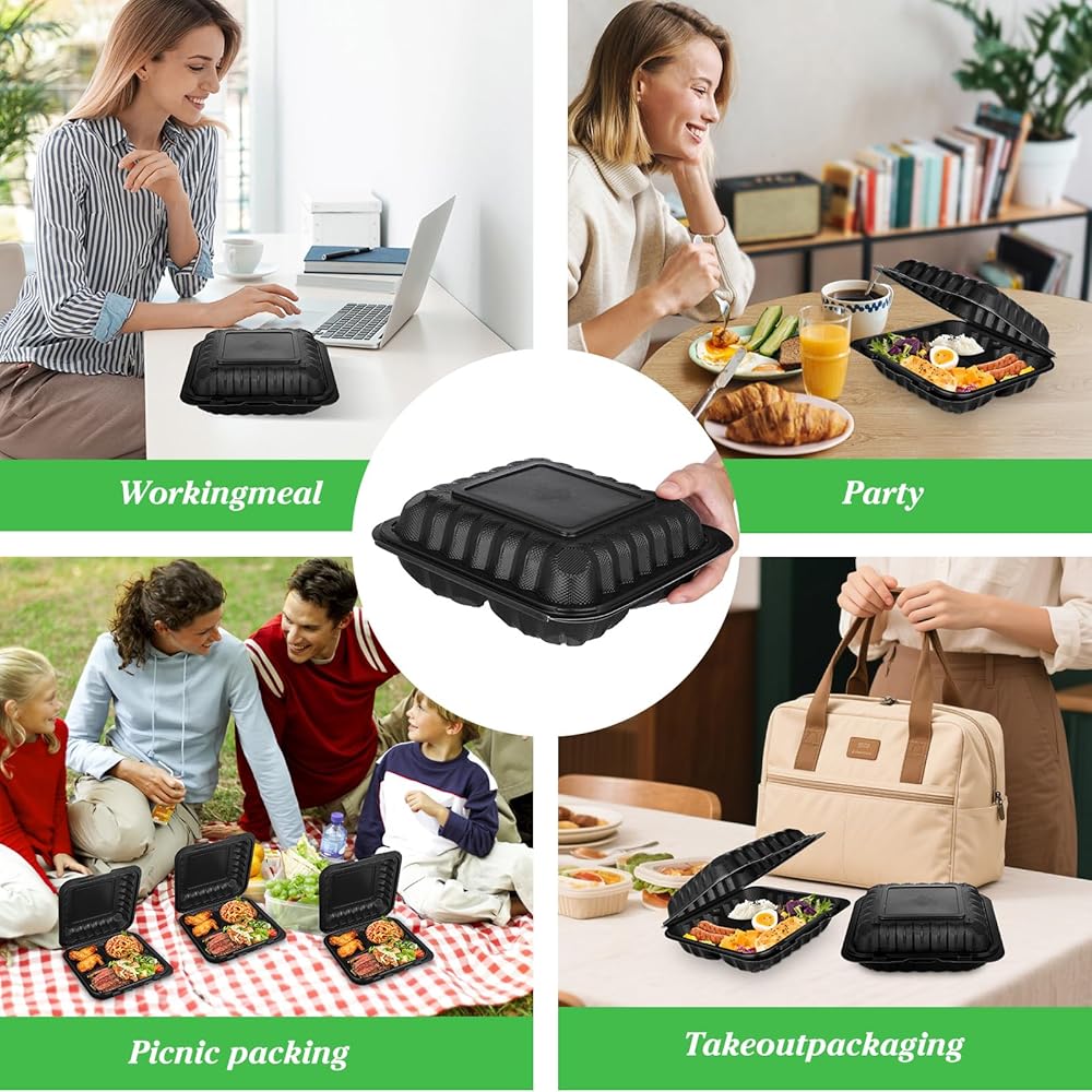 Versatile for All Occasions: From Lunches to Catering---50-pack is ideal for daily use (packing lunch for work/school) or events (picnics, parties, catering). Stackable design saves fridge/pantry space, and the sleek black color looks professional for restaurants or food trucks. These to go plates are great for portion control too—perfect for weight management or meal prep.