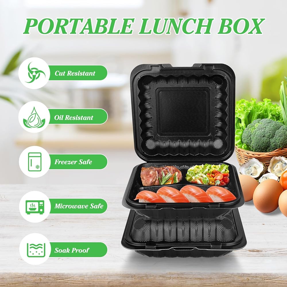 3-Compartment Design: Keep Meals Organized & Flavorful---Our 8"x8" clamshell containers feature 3 separate, deep dividers—perfect for separating rice/pasta、 veggies/meat, and (sauces/dressings). No more mixing flavors or soggy sides! Ideal for packing balanced lunches (e.g., grilled chicken, rice, and steamed veggies) or takeout meals that stay fresh.