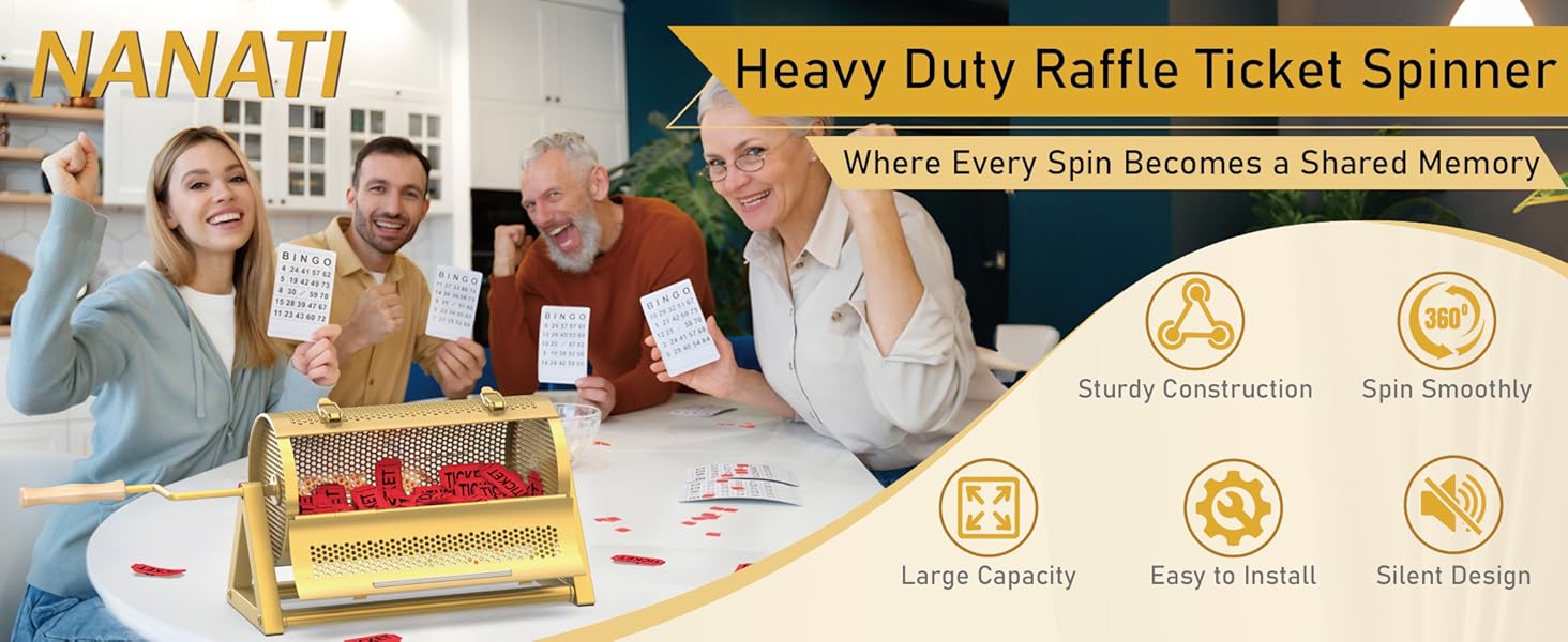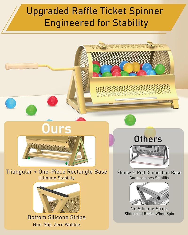 Unshakable Stability, Zero Wobble: NANATI raffle ticket spinner combines reinforced triangular frame and one-piece rectangular base for unshakable sdtability. Non-slip silicone pads underneath ensure zero wobble. Crafted from 1.2mm thickened metal, this raffle drum for tickets can resist dents and deformation