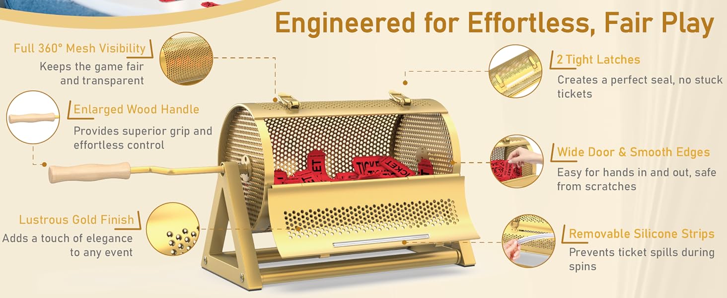 Silent Spinning & Enlarged Wooden Handle: Engineered for smooth and quiet operation, this raffle ticket drum features integrated silent bearings for a noise-free experience. With its enlarged wooden handle ( 3.94” in length—thicker and longer than standard handles), our ticket tumbler for raffle offers a comfortable and firm grip, allowing you to spin with ease and control throughout any event