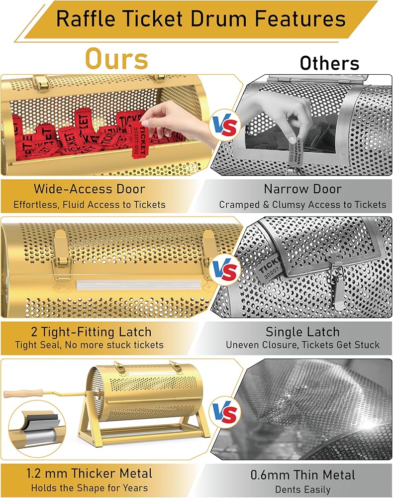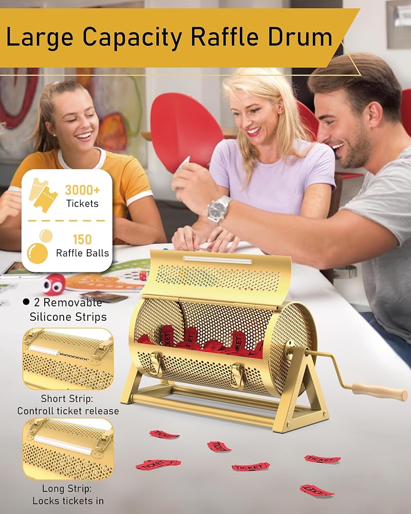 Wide Door & 2 Latches Prevent Stuck: Our large raffle drum is equipped with a generously sized door for smooth access, along with two tight-fitting latches (not just one) that seal tightly to prevent tickets from getting stuck. We also offer 2 removable silicone strips for flexible use, the longer one can be added at the entrance of the raffle box to prevent lottery tickets spills during spinning