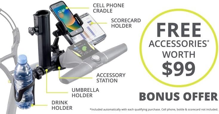 Bundle includes Motocaddy New M5 GPS Electric Cart, Holders for Umbrella/Scorecard/Drink, Device Cradle, Bushnell Wingman, 5 Ball Markers, & 1 Magnetic Hat Clip