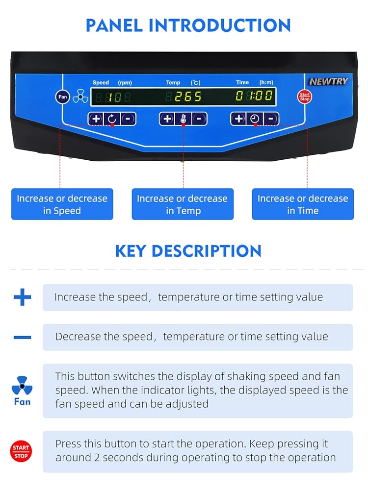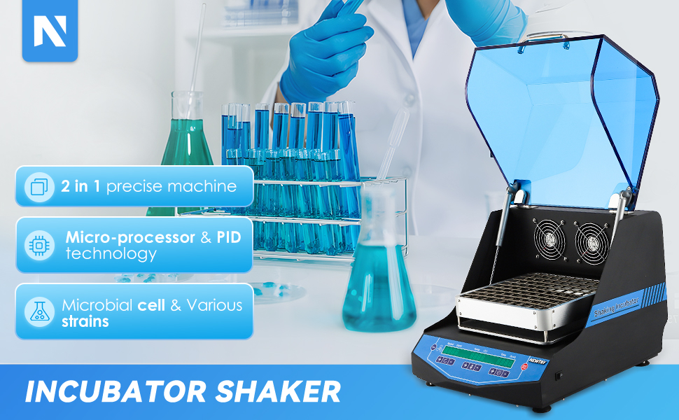 [PRECISE CONTROL]:This NEWTRY Incubator shaker uses microcomputer and PID cutting-edge technology to control temperature and oscillation frequency, with timing function, which meets the requirement of accurate experiment.