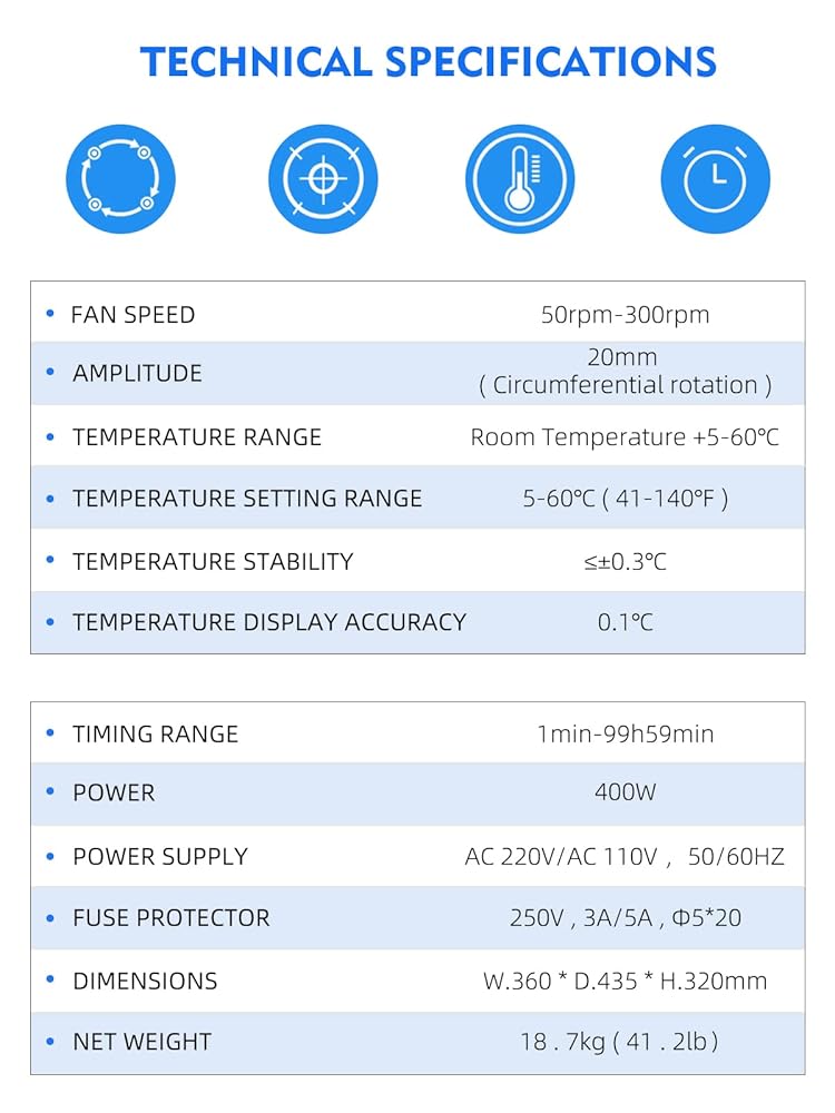 [IMPORTANT PARAMETERS]: Speed range 50-300rpm; temperature setting range 5-60℃(41~140 °F); timing range 1min -99h59min; amplitude 20mm (Circumferential rotation).