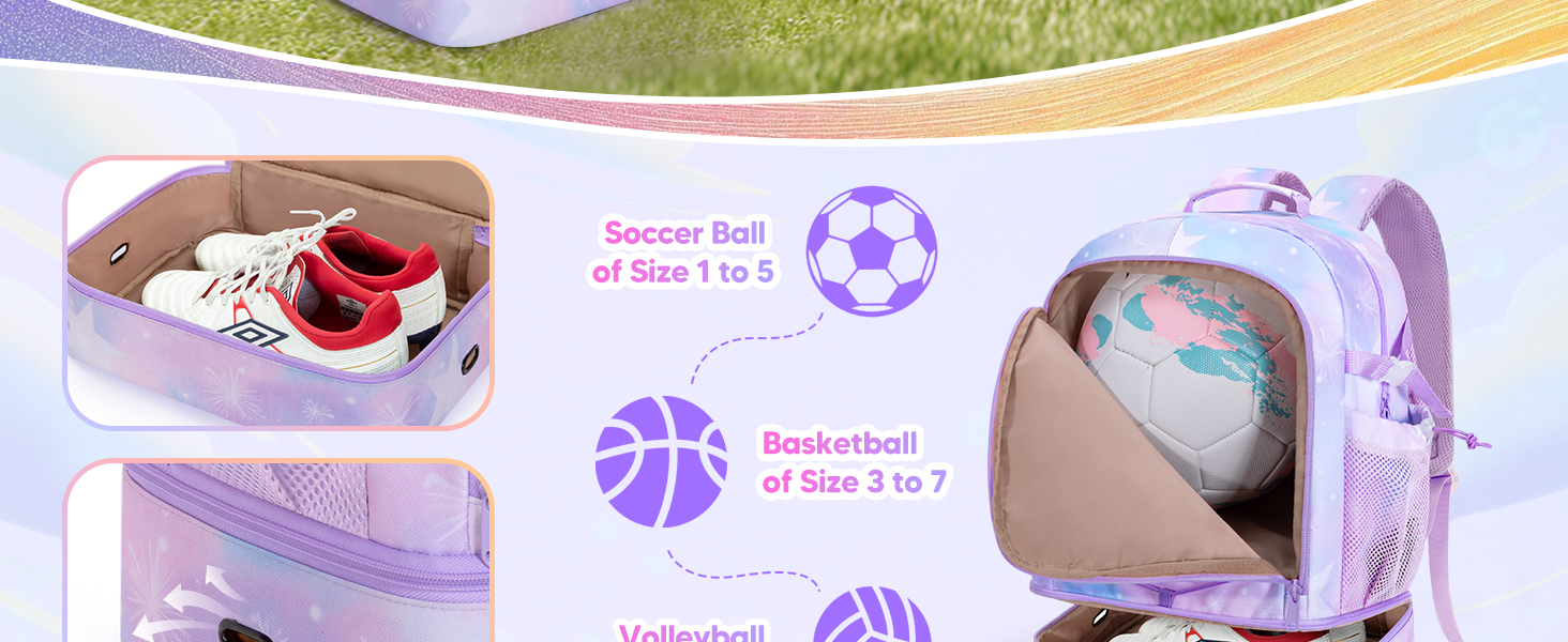 MAIN COMPARTMENT: There is a separate ball compartment which is suitable for all size soccer, basketball and volleyball. The spacious compartment with inner open pocket is totally enough for all gear.