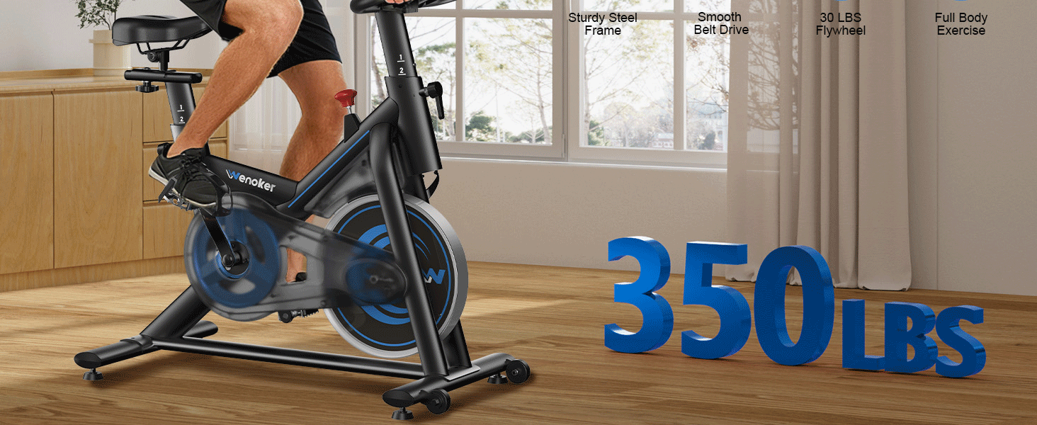 350LB Weight Capacity & Heavy-Duty Frame: This stationary bike for home features a reinforced steel triangular frame that supports up to 350LB for exceptional stability and durability. It stays solid and wobble-free during every workout, giving you a safe and confident ride.