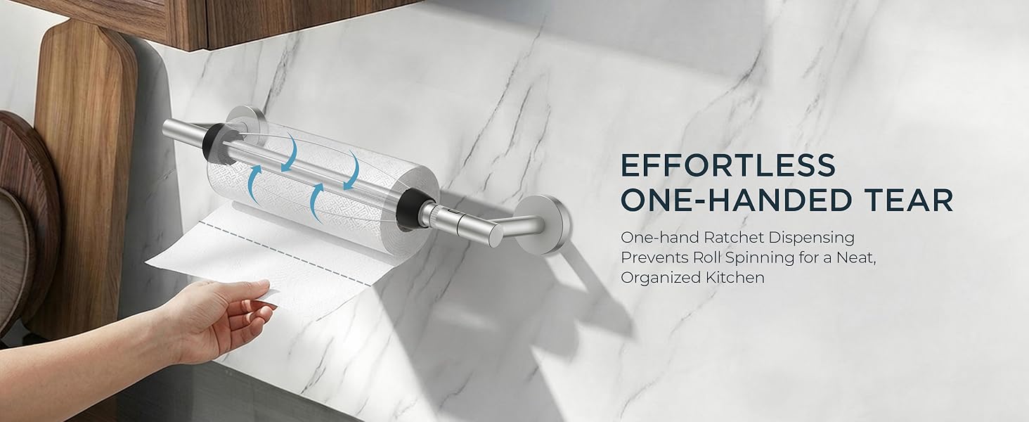 Smooth One-Hand Tear: The advanced mechanical ratchet system ensures controlled, even paper feed—eliminating over‑spinning or messy tears. The kitchen paper towel holder under cabinet keeps the roll tidy and ready to use every time