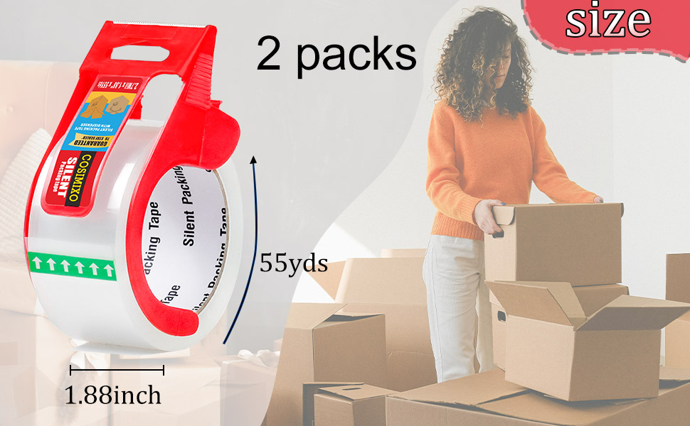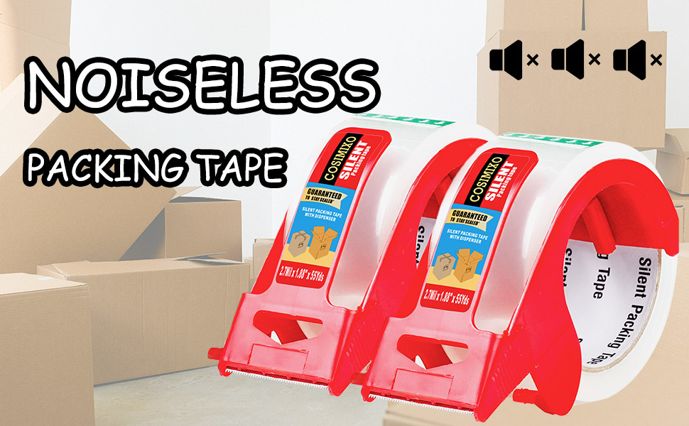No Noise Packing Tape- 2-pack Clear 2.7Mil x 1.88" x 55yds with dispenser ,100% silent and noiseless tape that does not disturb others when packaging. It is also very quiet compared to ordinary packaging tape.