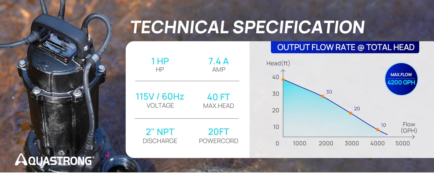 Efficient 4200 GPH Flow Rate: The sewage pump delivers 4200 GPH flow and provides a max lift of 40 ft. Powered by 115V single-phase electricity for enhanced performance, it's an Ideal for situations such as basement sump basin and sewage ejector pump systems. DO NOT use in gasoline, alcohol, or biogas tanks.