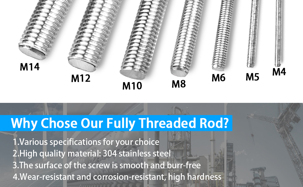 【Good Quality Material】Fully Threaded Rod Made of 304 stainless steel, ductility at high temperatures, and low magnetic permeability.Provides great corrosion resistance and antirust ability for a long service life.
