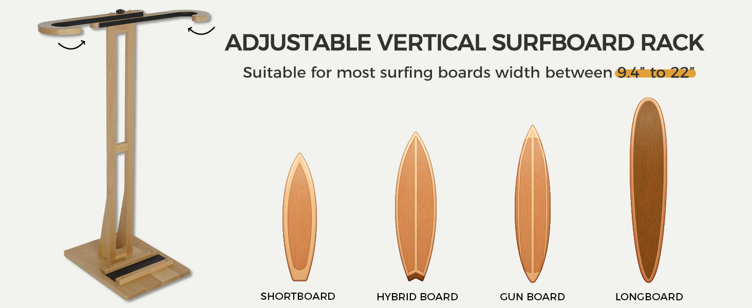 ADJUSTABLE VERTICAL SURFBOARD RACK --- The arm of our surfboard standing rack is adjustable, suitable for surfing boards width between 9.4” to 22”. Before purchasing, please confirm your surfboard width