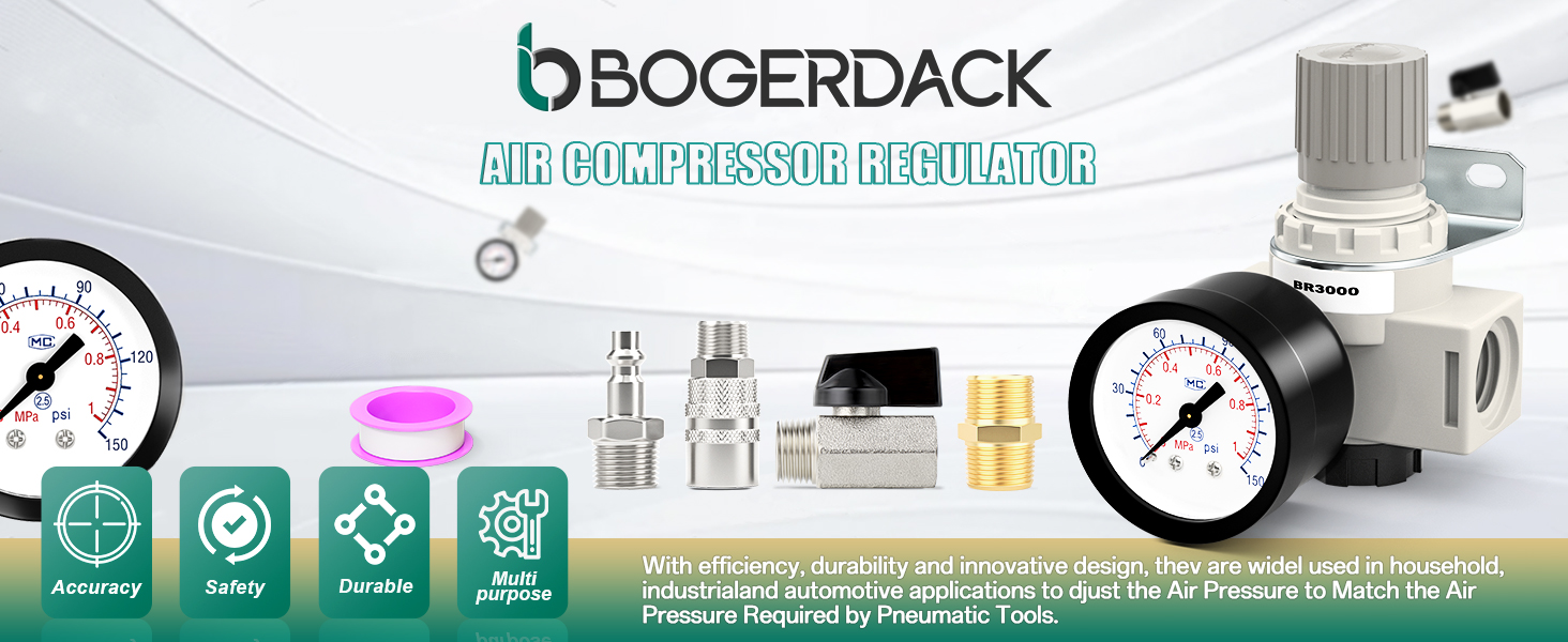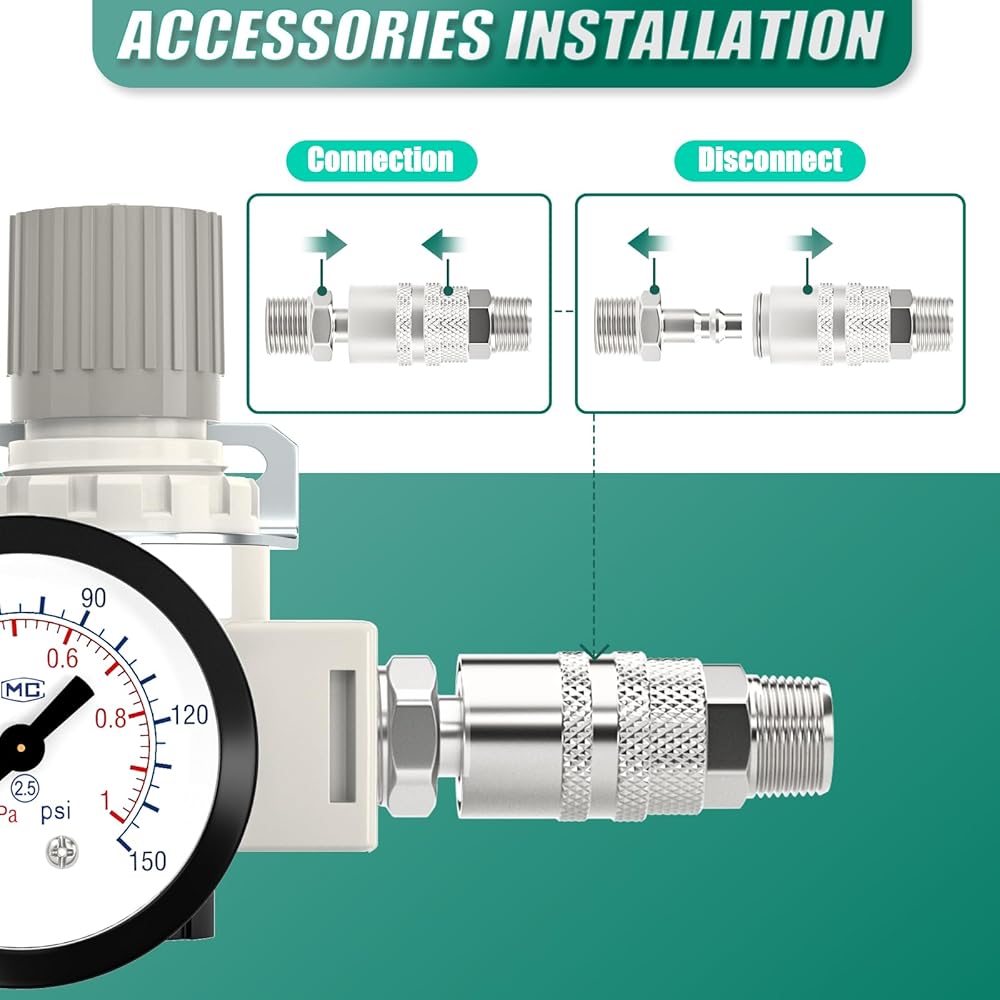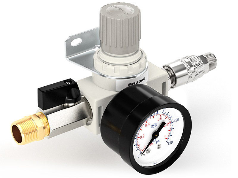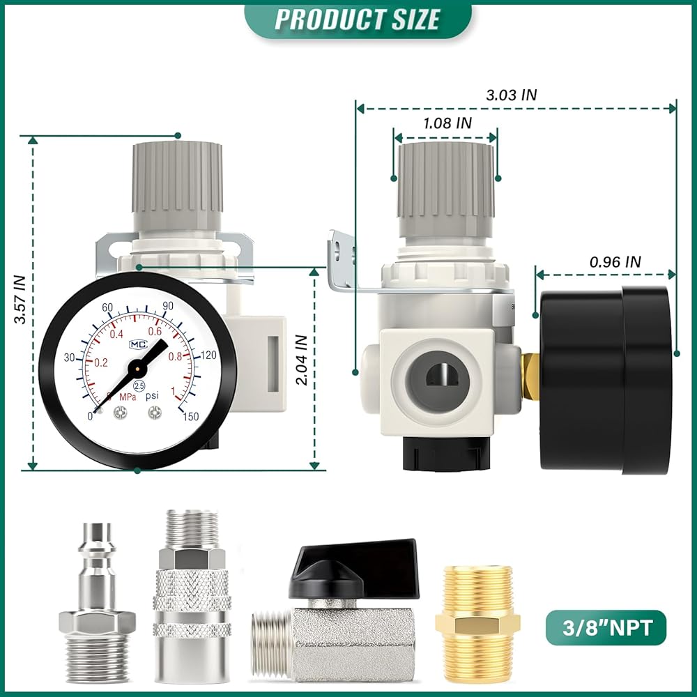 PACKAGE INCLUDED: 1 x AR3000(Air Pressure Regulator), 1x Dial gauge for the 1/8" NPT,1 x Valve Shut Off Switch, 2 × Male Pipe 3/8" × 3/8" NPT, 1 × Nickel-plated Iron Air Plug, 1 × Nickel-plated Iron Air Coupler, 1 × Teflon tape.