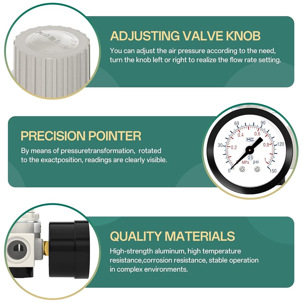 ADJUSTING VAVLE KNOB: With the valve knob, you can adjust the air pressure according to the need, turn the knob left or right to realize the flow rate setting, knob with a lock function, and cannot be turned when the knob is pressed.